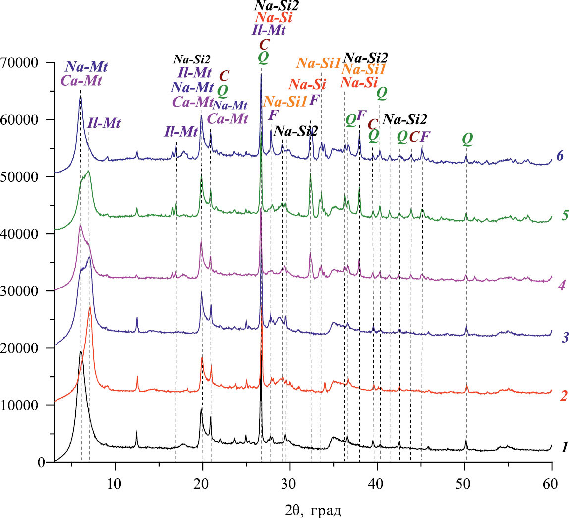 Рис. 3. Модифицированная глина ХБГП (1 – ХБГП-W, 2 – ХБГП-Carb, 3 – ХБГП-Az, 4 – ХБГП-W-Alk, 5 – ХБГП-Carb-Alk, 6 – ХБГП-Az-Alk; Q – кварц [12], F – калиевый полевой шпат, KAlSi3O8 [13], Na-Mt – монтмориллонит в Na-форме, NaMgAlSiO2(OH)⋅H2O [15], Ca-Mt –монтмориллонит в Ca-форме, Ca0.2(Al, Mg)2Si4O10(OH)2⋅4H2O [16], Il-Mt – иллит-монтмориллонит, KAl4(Si, Al)8O20(OH)4⋅xH2O [17], C – кальцит, CaCO3 [18], Na-Si – силикат натрия водный, Na2SiO3⋅5H2O [21], Na-Si1 – гидросиликат натрия, NaHSi2O5 [22], Na-Si2 – силикат натрия водный, Na2Si2O5⋅5H2O [20]).