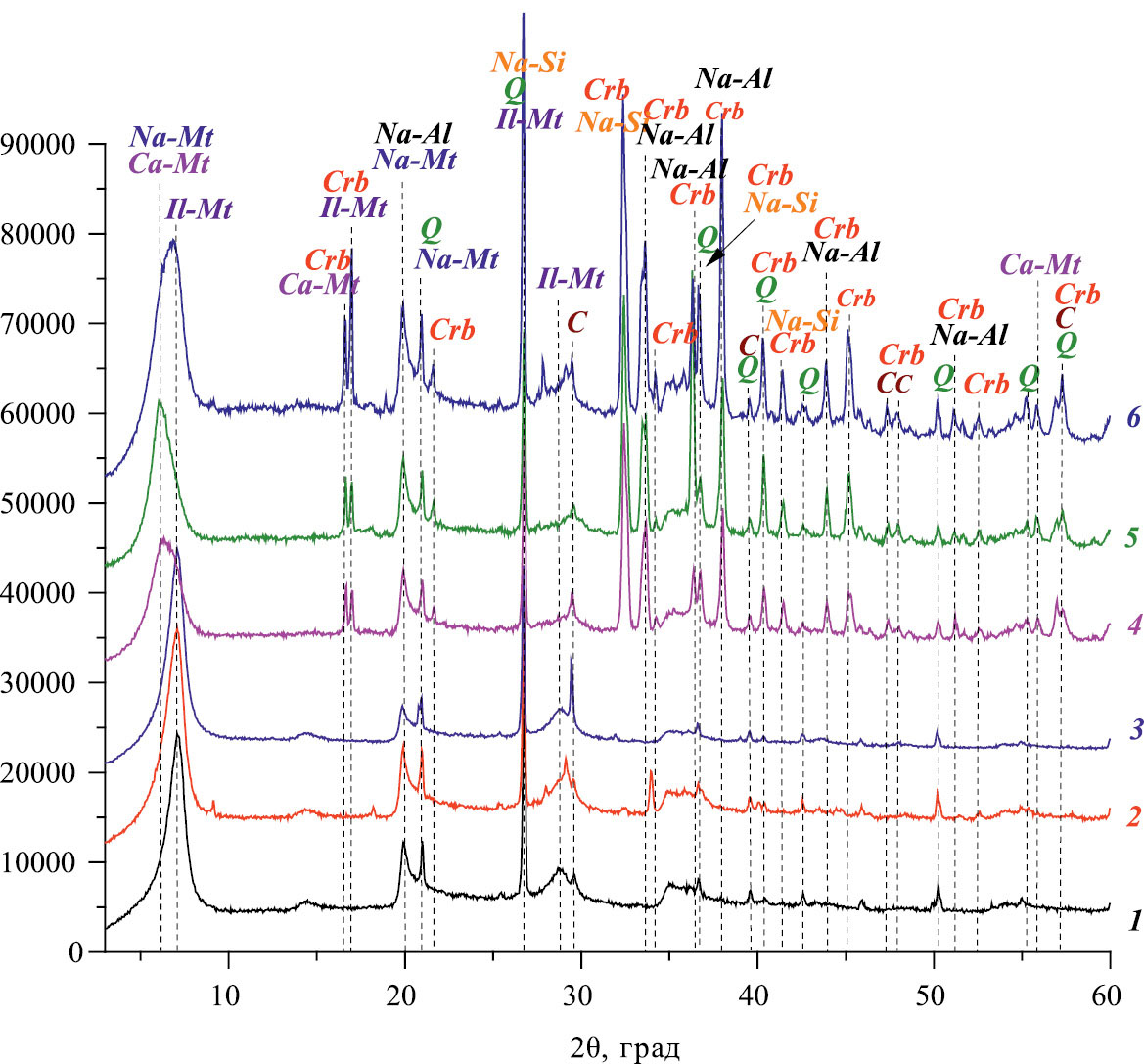 Рис. 4. Модифицированная глина ДБ (1 – ДБ-W, 2 – ДБ-Carb, 3 – ДБ-Az, 4 – ДБ-W-Alk, 5 – ДБ-Carb-Alk, 6 – ДБ-Az-Alk; Q – кварц [12], Na-Mt – монтмориллонит в Na-форме, NaMgAlSiO2(OH)⋅H2O [15], Ca-Mt –монтмориллонит в Ca-форме, Ca0.2(Al, Mg)2Si4O10(OH)2⋅4H2O [16], Il-Mt – иллит-монтмориллонит, KAl4(Si, Al)8O20(OH)4⋅xH2O [17], C – кальцит, CaCO3 [18], Na-Al – алюминат натрия, Na5AlO4 [19], Na-Si – силикат натрия водный, Na2SiO3⋅5H2O [21], Crb – карбонат натрия водный Na2CO3⋅H2O [22]).