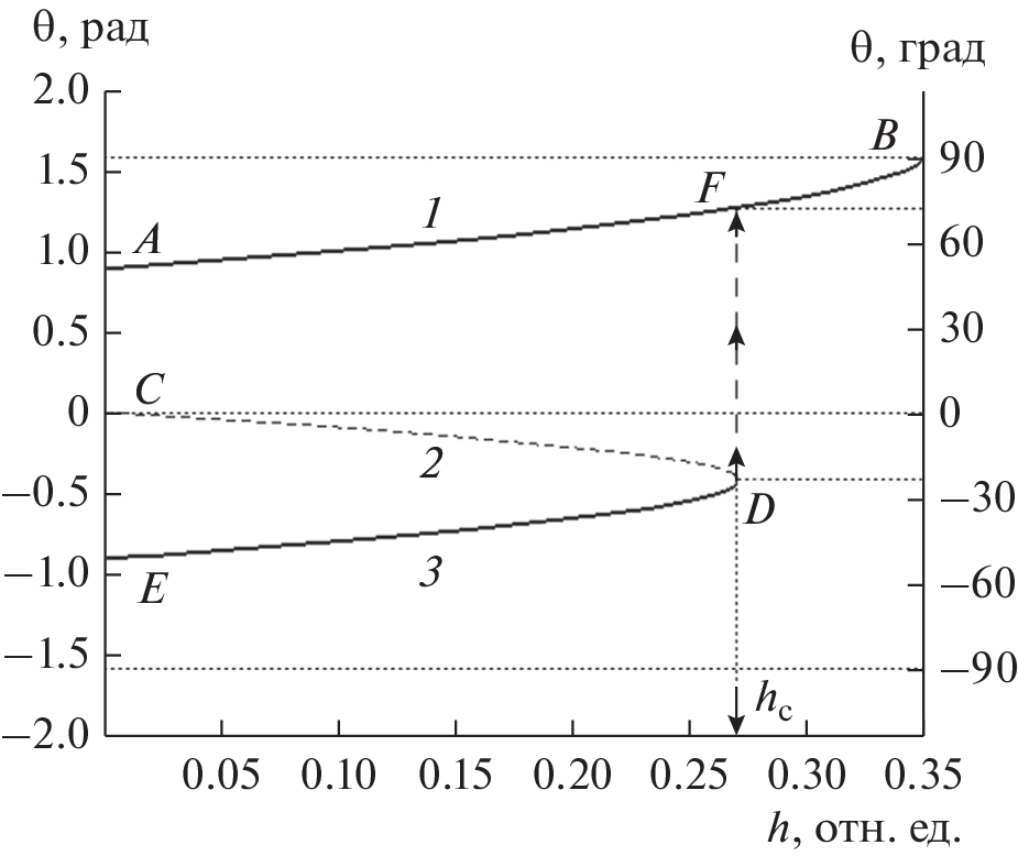 orders is considered. For this case, an algebraic equation of the third degree is obtained for the analysis of which the Cardano discriminant is used. It is shown that in the case of a negative value of the discriminant, the dependence of the magnetization orientation on the field has a hysteresis character.
