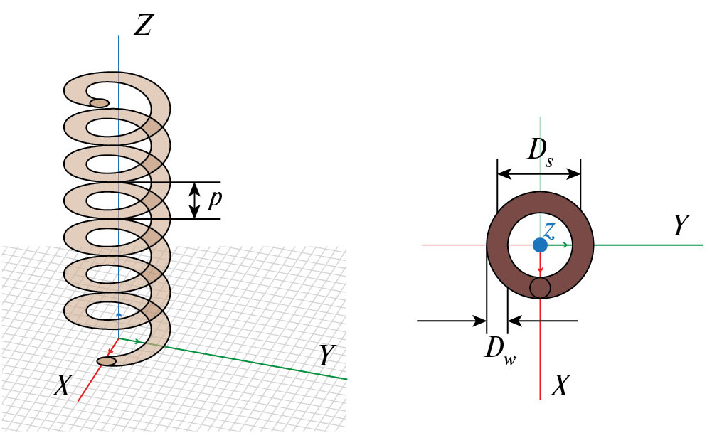 Рассмотрим уединенную бесконечно протяженную вдоль оси z спиральную линию (рис. 1), которая представляет собой однозаходную цилиндрическую спираль с постоянным шагом намотки p, изготовленную из металлического проводника с поперечным размером Dw. Средний и внешний диаметры спирали равны соответственно Ds и Ds+Dw. Для исследования ее дисперсии будем использовать программу численного моделирования HFSS (https://ansys.com) в режиме вычислений собственных значений. Этот подход предполагает построение модели единичной ячейки исследуемой линии и использование граничных условий периодичности. В данном случае такая ячейка представляет собой один виток спирали, расположенный внутри воздушного бокса с достаточно большим поперечным сечением (рис. 2). На гранях бокса в направлении оси z используем условия периодичности, связывающие поля в двух сечениях линии, расстояние между которыми равно периоду спирали. На границах бокса вдоль осей x и y используем поглощающие слои, описываемые граничными условиями типа PML (Perfect Matched Layers). PML-слои (на рис. 2 не показаны) расположены на некотором удалении от оси линии, ограничивая область решения задачи в поперечной плоскости x0y. Использование периодических и граничных PML-условий позволяет получать численное решение в задачах на собственные значения для открытых периодических структур, в частности для спиральной линии. Поле замедленной собственной волны спиральной линии спадает при удалении от нее, поэтому поглощающие слои, расположенные на достаточном удалении от спирали, практически не влияют на постоянную распространения волны и дисперсионную характеристику линии.