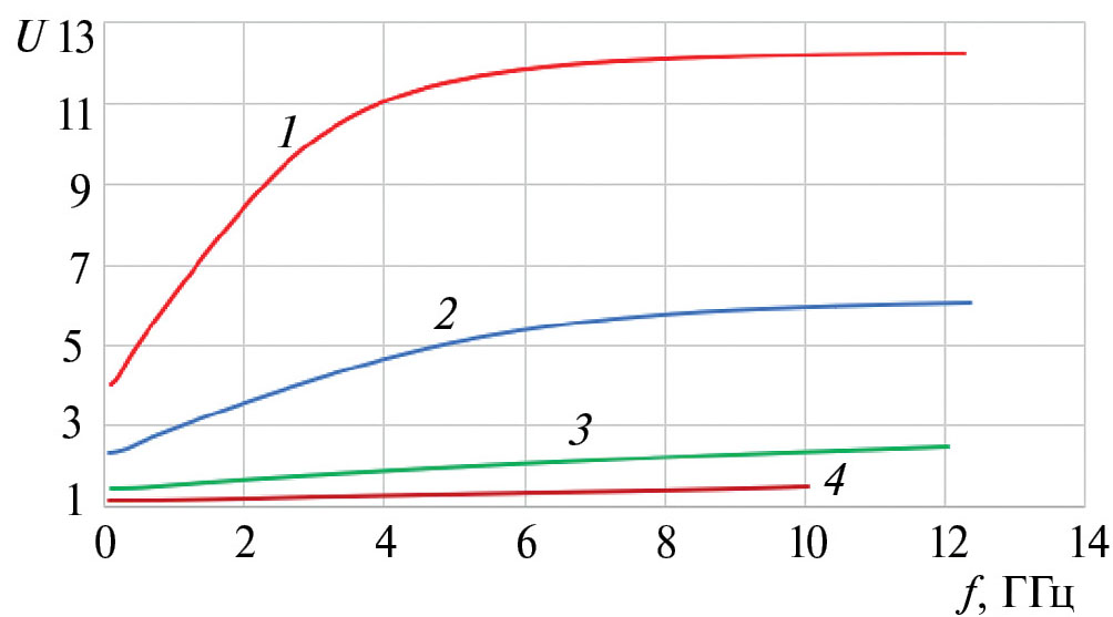 Рис. 3. Дисперсионные характеристики спиральной линии при Ds = 4 мм, Dw = 1 мм, p = 1 (1), 2 (2), 5 (3), 10 мм (4).