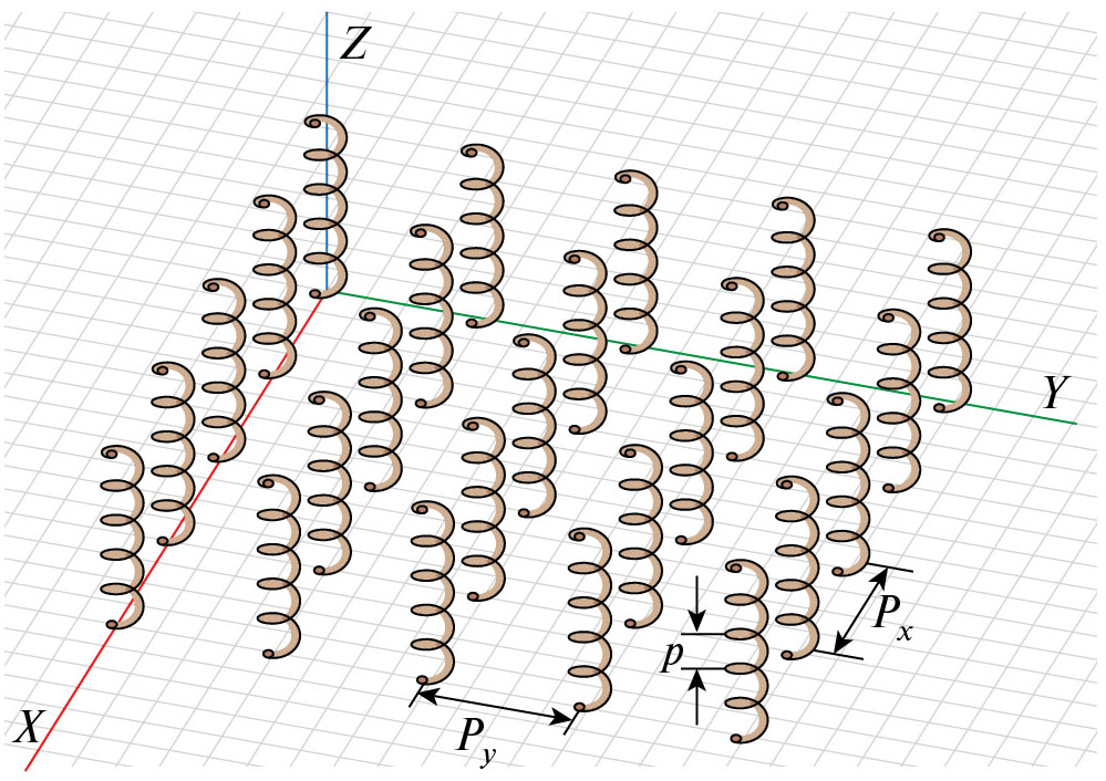 Исследуем теперь дисперсию собственных волн в двумерно-периодической решетке спиральных линий с шагом намотки p, ориентированных вдоль оси z (рис. 15). В общем случае периоды решетки вдоль осей x и y могут быть разными. Рассмотрим случай квадратной решетки с одинаковыми периодами Px = Py.
