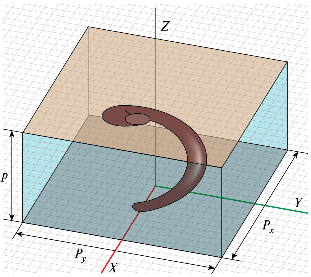 Пусть величина δφy обозначает фазовый сдвиг между соседними линиями. Для расчета дисперсионных характеристик собственных волн в решетке при разных значениях δφy используем метод, аналогичный описанному выше для одиночной линии. Так как в данной структуре имеются два направления периодичности, выделяем одну ячейку структуры вдоль оси y и один виток спирали вдоль оси z и окружаем выделенную ячейку прямоугольным воздушным боксом (рис. 9), который определяет область решения в данной модели. Размеры бокса вдоль осей y и z равны соответственно Py и p, а размер в направлении оси х ограничен PML-слоями, расположенными на границах бокса вдоль этой оси. Так как структура не является периодической вдоль оси х, то размер ячейки вдоль нее не определяется однозначно параметрами структуры, и имеется определенная свобода выбора.