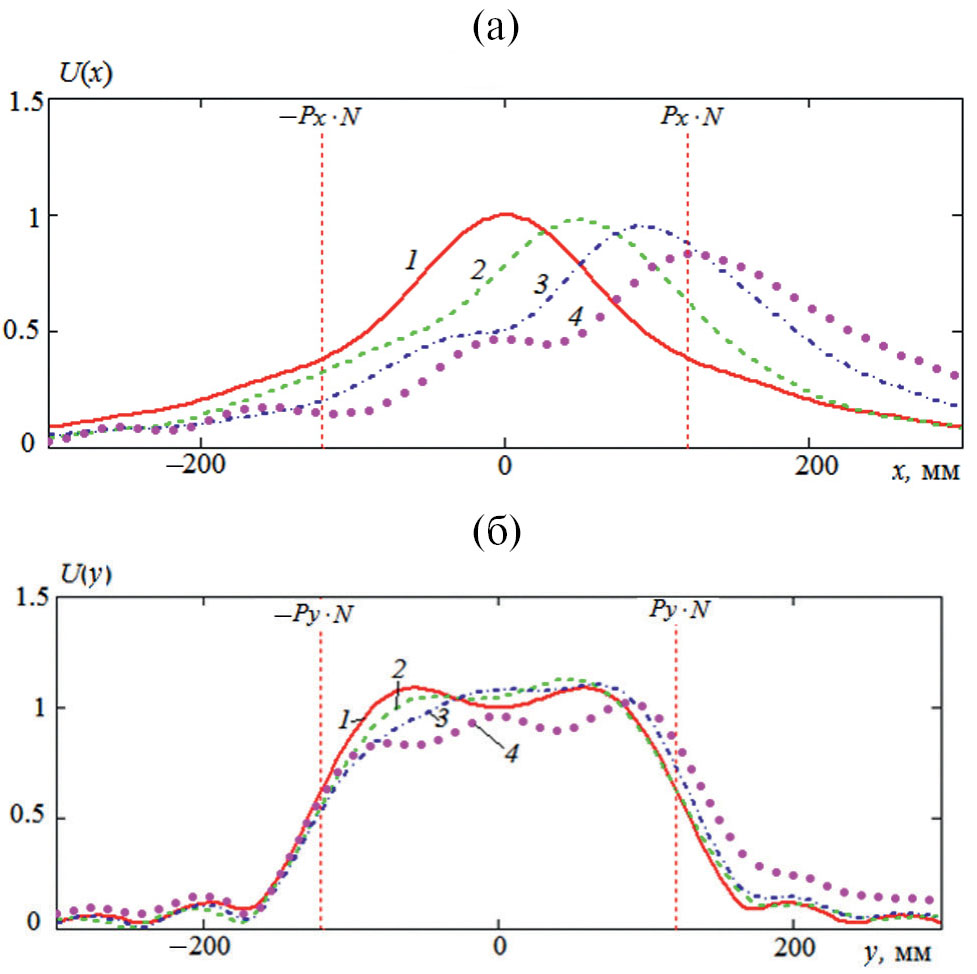 Рис. 7. Напряженность поля для кластера ТЕМ-рупоров с косинусоидальным амплитудным распределением на частоте 5 ГГц: отклонение луча 0 (1), 15 (2), 30 (3) и 45 град (4), сканирование в Н- (а) и Е-плоскости (б).