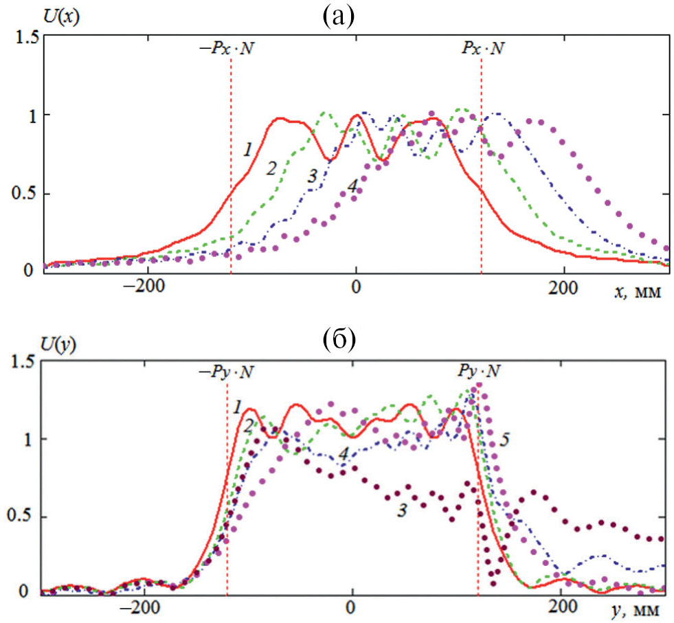 Из данных, представленных на рис. 4–6, можем сделать вывод, что распределение поля в выходной апертуре решетки существенно отличается от распределения поля на входах элементарных излучателей, которое задается функциями An0, Am0. При этом можно выделить два вида искажений: искажение формы амплитудного распределения и его смещение. Второй эффект имеет место только при сканировании и зависит от угла отклонения θ.