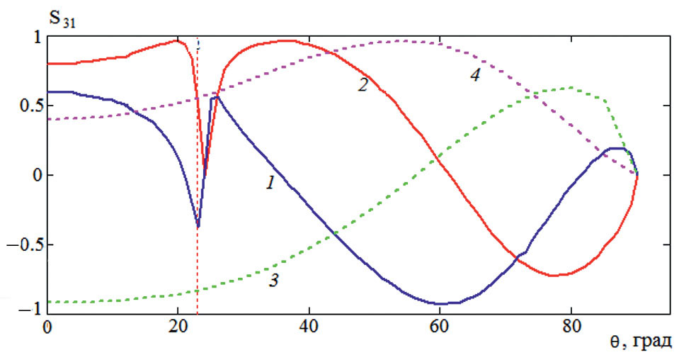 Рис. 12. Зависимость действительной (1, 3) и мнимой (2, 4) частей параметра рассеяния S31 ячейки Флоке для решетки антенн Вивальди от угла сканирования на частоте 8 ГГц при L = 180 (сплошные кривые) и L = 90 (штриховые).