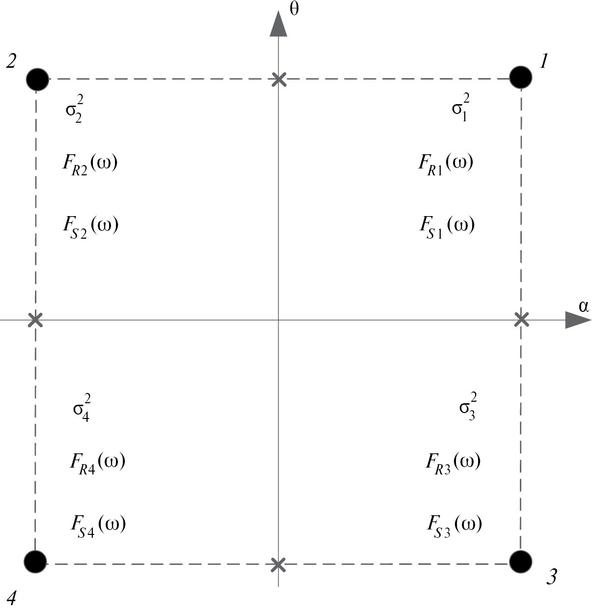 – обобщенная (азимут или угол места) координата i-й точки многоточечной модели; – обобщенная координата (азимут или угол места) координата i-й точки четырехточечной модели; – мощность сигнала, отраженного от i-й точки многоточечной модели; и – собственные и взаимные нормированные спектральные плотности мощности сигнала, отраженного от i-й точки многоточечной модели.