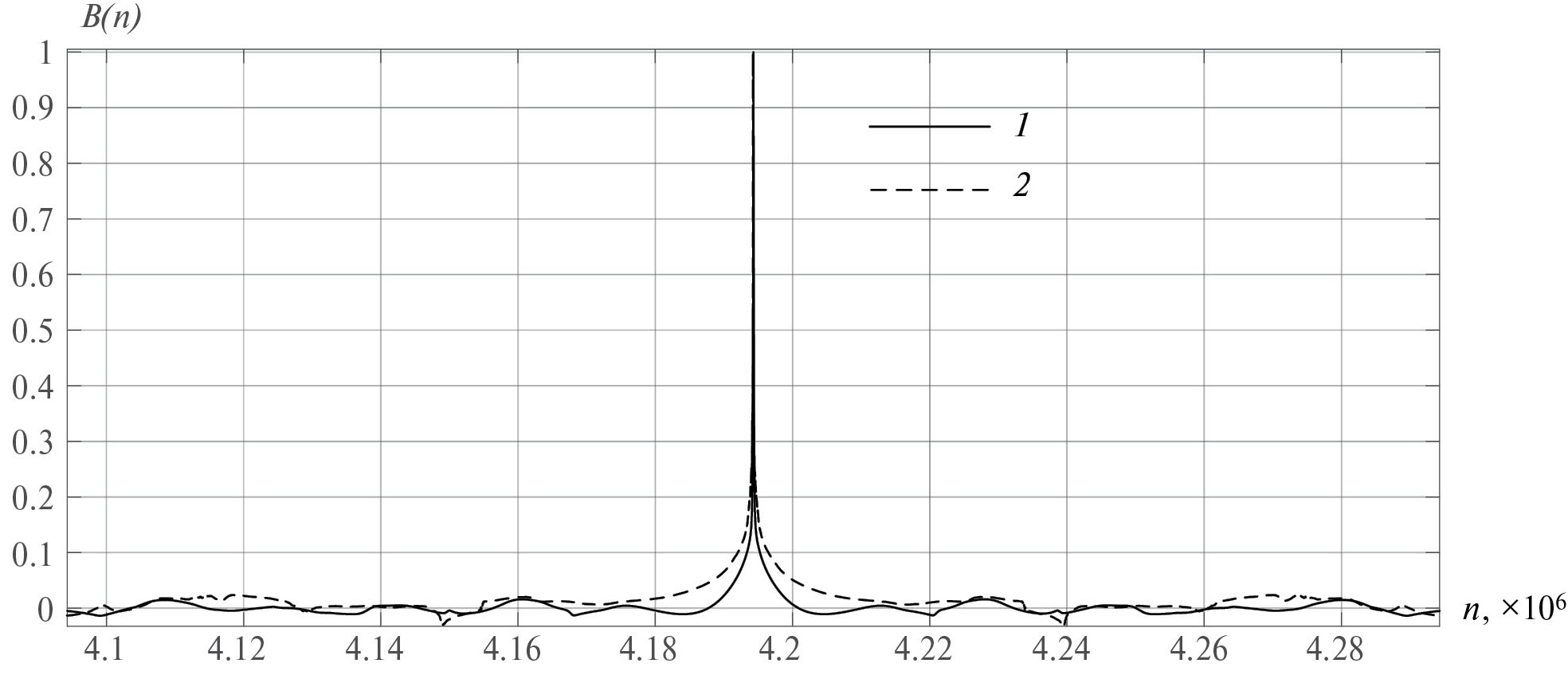 Рис. 7. Нормированная корреляционная функция угловых шумов при носовом ракурсе наблюдения: 1 – эксперимент, 2 – теоретический расчет; имитируемая дальность 1000 м; n – номер отсчета корреляционной функции угловых шумов.