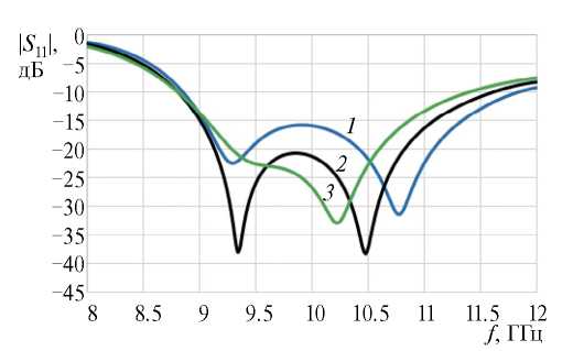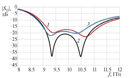 Графики на рис. 3–5 свидетельствуют о том, что частота минимума коэффициента отражения, определяемая резонансной частотой области перехода, зависит от обоих параметров N и L1, в то время как длина зонда на верхнем слое L2 влияет в основном на уровень согласования. Из сопоставления рис. 3–5 следует, что наилучшим сочетанием параметров по критерию ширины полосы согласования перехода является N = 0.7 (рис. 3, кривая 2), L1 = 6.5 (рис. 4, кривая 2), L2 = 8 (рис. 5, кривая 3). Значению N = 0.7 соответствуют значения S = 4.2, S+S1 = 7.2. Однако даже в этом случае уровень согласования перехода лучше чем –10 дБ достигается с частоты немного выше 9 ГГц, т. е. такой переход является более узкополосным по сравнения с переходом в [14], в котором отмеченный уровень согласования достигается во всем диапазоне частот 8…12 ГГц.