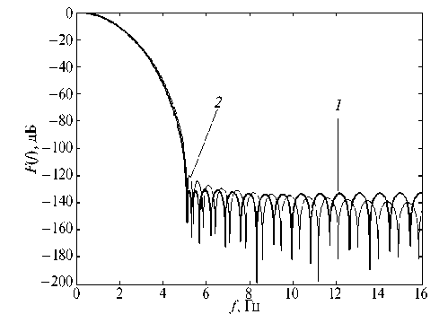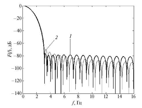 Рис. 3. Спектры оконной функции субоптимального окна φ-класса при α = 4.05 (1) и оконной функции Кайзера при αk = 4 (2), для обеих кривых β = 1.