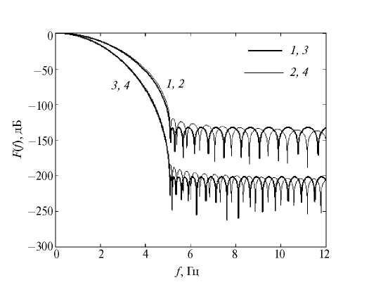 Рис. 10. Спектры оконных функций субоптимального окна Ψ-класса: α = 5.0744 при β = 1 (1) и 1.5 (3); спектры оконных функций окна Кайзера: αk = 5 при β = 1 (2) и 1.5 (4).