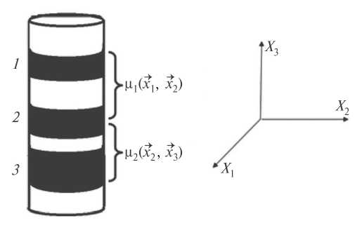 Рассмотрим проводящий пятислойный нанодиск, три слоя которого магнитные из пермаллоя, а два слоя, лежащие между ними, — немагнитные (рис. 1). Состав пермаллоя (Py) — Ni80Fe20. Пусть в каждом из магнитных слоев существует магнитный вихрь как основное состояние. Для приближенного аналитического исследования стационарной динамики таких вихрей одинаковой хиральности можно использовать эффективные уравнения для векторов, определяющих положения центров вихрей [14]. Энергию этой системы в приближении парного взаимодействия слоев запишем следующим образом: