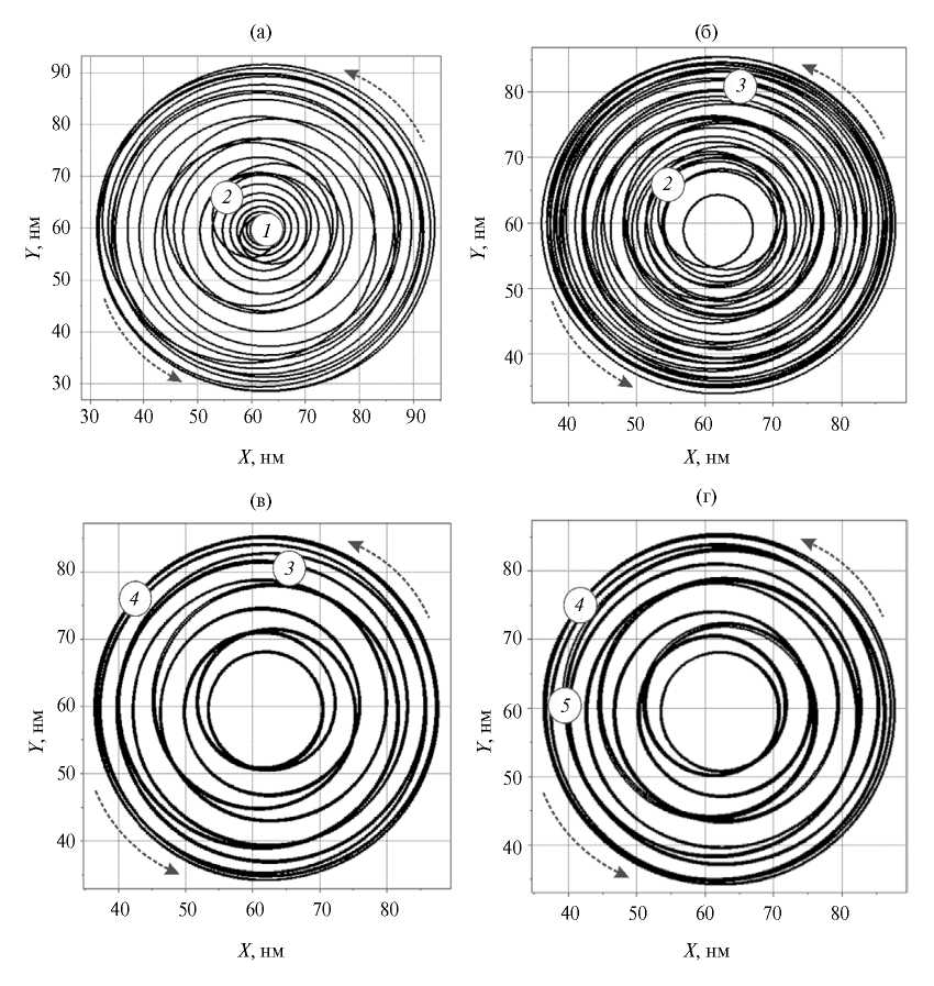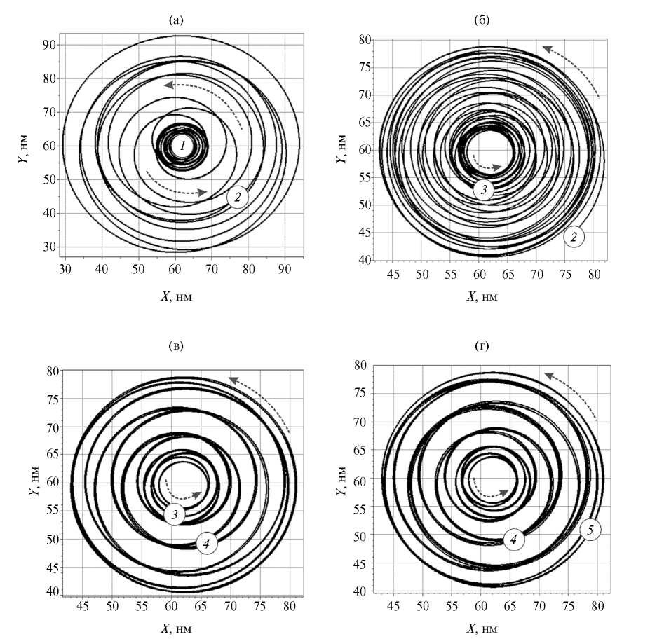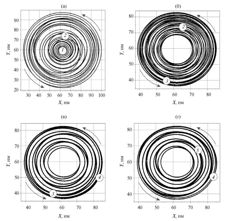 Рис. 2. Траектории движения кора вихря в верхнем слое, полученные для случая 15/15/15 при токе 28.27 мА для интервалов времени: 0…25 (а), 25…50 (б), 50…75 (в), 75…100 нс (г); обозначены моменты времени: 0 (1), 25 (2), 50 (3), 75 (4) и 100 нс (5).