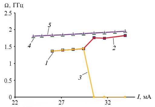 Рис. 5. Зависимости частоты стационарных колебаний вихрей от величины тока для трехслойной структуры: три магнитных вихря движутся с одинаковой частотой (1), два магнитных вихря движутся с одинаковой частотой (2), вылет вихря за край в третьем магнитном слое (3); для двухслойной структуры: частота колебаний для первого (4) и второго (5) слоев.