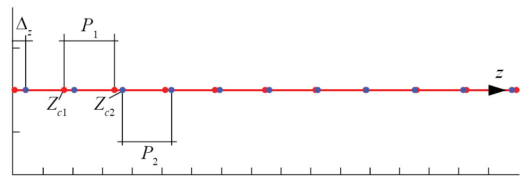 Бипериодическая АРПП схематично показана на рис. 5. Она состоит из линии передачи, ориентированной вдоль оси 0z и двух решеток излучателей в виде контуров с разными резонансными частотами fr1,2, добротностями Q1,2 и резонансными активными сопротивлениями R1,2. Контуры расположены с периодами P1,2.