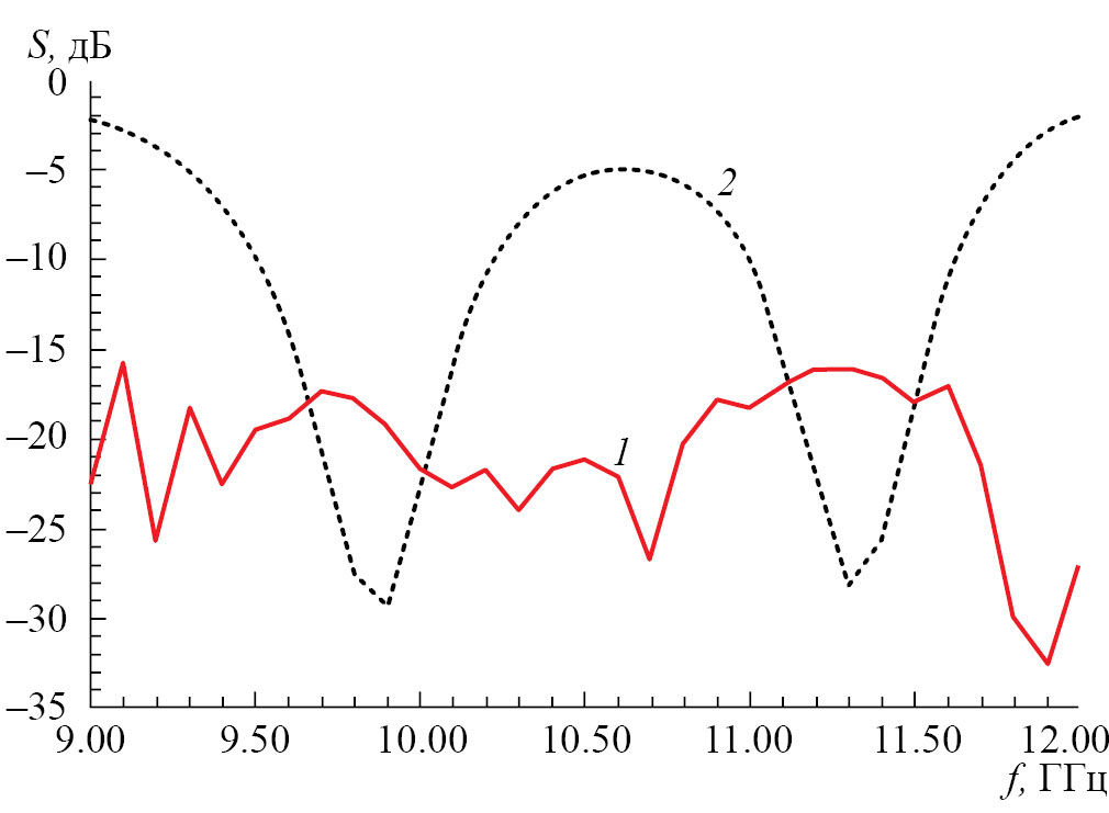 Расчет проводился при помощи системы электродинамического моделирования Ansys HFSS 2019. Частотная зависимость элементов матрицы рассеяния решетки представлена на рис. 12. Кривые 1, 2 соответствуют коэффициентам отражения и прохождения. Видно, что коэффициент отражения (кривая 1) не превосходит –15 дБ в полосе частот 9…12 ГГц, а коэффициент прохождения (кривая 2) имеет два минимума с амплитудой менее –25 дБ, что указывает на наличие излучения вблизи указанных минимумов. Ширины этих провалов по уровню –15 дБ составляют 0.5 ГГц в низкочастотном диапазоне и 0.4 ГГц в высокочастотном.