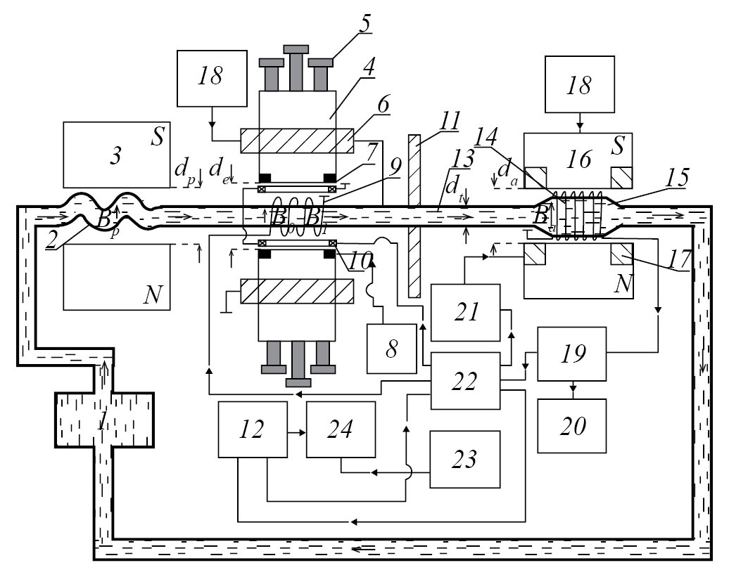 Рис. 3. Экспериментальный стенд для исследований потоков жидких сред в различных условиях с функцией ядерно-магнитного расходомера-релаксометра: 1 – циркулярный насос, 2 – сосуд специальной формы из немагнитного материала, 3 – магнит-поляризатор, 4 – полюсные наконечники электромагнита, 5 – регулировочные винты положения полюсов электромагнита, 6 – катушки магнитного поля для полюсных наконечников, 7 – коррекционные катушки, 8 – специальный блок питания коррекционных катушек, 9 – катушка нутации, 10 – катушки модуляции поля В0, 11 – магнитный экран, 12 – генератор нутации, 13 – соединительный участок трубопровода, 14 – катушка регистрации сигнала ЯМР, 15 – сосуд-анализатор, 16 – электромагнит с управлением значения поля Ва, 17 – катушки модуляции поля Ва, 18 – многофункциональный блок питания электромагнитов 6 и 16, 19 – устройство регистрации сигнала ЯМР, 20 – осциллограф, 21, 23 – радиочастотный генератор, 22 – устройство управления и обработки, 24 – частотомер двухканальный.