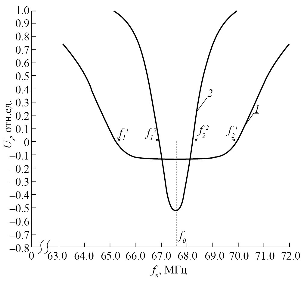 Рис. 5. Контур линии нутации потока водопроводной воды с намагниченностью при qопт = 2.59 мл/с в поле В0 = 1.5871 Тл (центральная зона между полюсными наконечниками магнитной системы) и различных значениях неоднородности магнитного поля ΔВ0 в зоне размещения катушки нутации (мТл∙см–1) и В1 (мкТл): 27.62, 2.69 (кривая 1), 114.43, 5.67 (кривая 2).