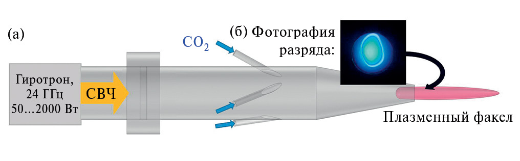 Плазма создается и нагревается непрерывным электромагнитным излучением технологического гиротрона (частота 24 ГГц, мода TE11, мощность 20 … 5000 Вт, линейная поляризация), которое через водоохлаждаемое вакуумное окно из нитрида бора поступает в реактор (плазмотрон) (рис. 1). Реактор является продолжением сверхразмерного волноводного тракта гиротрона с внутренним диаметром 32.6 мм. Углекислый газ подается в плазмотрон при атмосферном давлении через три симметрично расположенные трубки, составляющие угол 30° с образующей цилиндра плазмотрона и обеспечивающие закрученные потоки газа. С целью увеличения плотности мощности излучения волноводный тракт имеет плавное сужение в виде конического рупора длиной 60 мм с диаметром выходного отверстия 10 мм. Внутри конического волновода разряд, поддерживаемый СВЧ-излучением в потоке углекислого газа, представляет собой плазменное образование, локализованное в области максимального значения электрического поля волны (вблизи выхода) и вытянутое вдоль направления поля. Центральную область плазмы с характерным поперечным размером 5 … 8 мм обтекает более холодный газ с периферии волновода, который, проходя через сильно нагретую плазму, формирует на выходе плазмотрона плазменный факел длиной 50 … 100 мм с характерным диаметром 6 … 10 мм (см. рис. 1а).