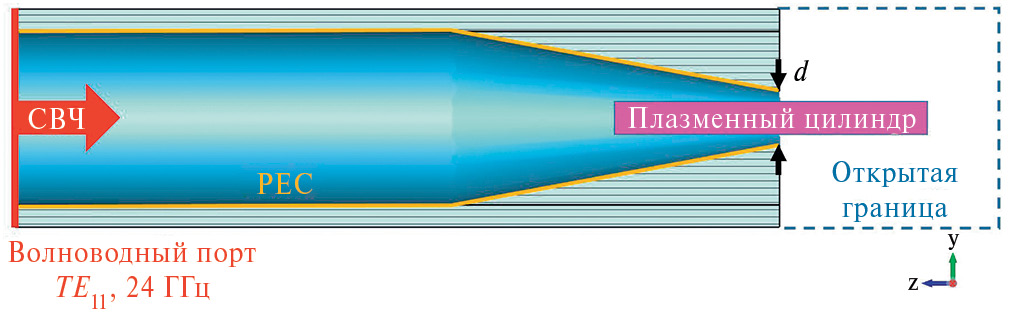 Область пространства, занятая плазмой на выходе конического участка плазмотрона, представлена цилиндром, геометрические размеры которого соответствуют параметрам наблюдаемого в эксперименте плазменного образования: диаметр 6 мм, общая длина 50 мм, смещение за границы конической части плазмотрона 20 мм. Точность геометрической формы плазменного факела не оказывает существенного влияния на результаты моделирования, в том числе ввиду того, что на достаточно малом масштабе (менее длины волны) детали формы поверхности области, занятой плазмой, не меняют распределение полей. Свободное пространство в модели имело свойства вакуума, поскольку нейтральные неионизованные газы практически не влияют на распространение СВЧ-излучения с частотой 24 ГГц и не взаимодействуют с ним.