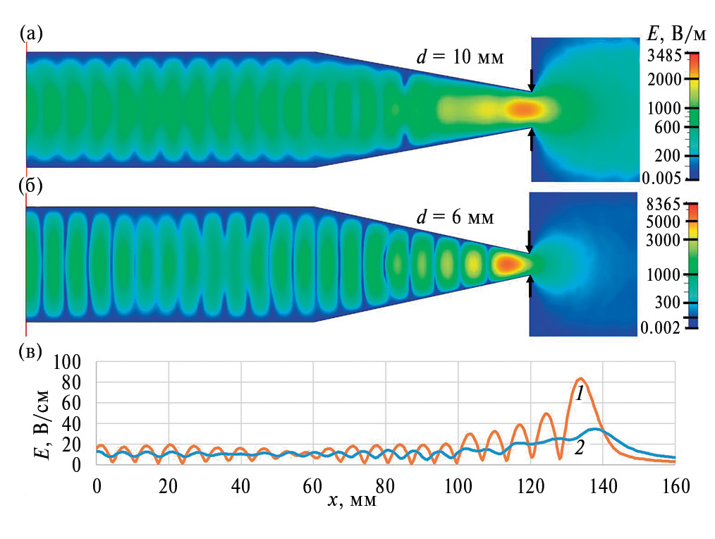 На рис. 3 приведено сравнение распределений среднеквадратичного значения напряженности электрического поля в плазмотроне при отсутствии плазмы для значений диаметра выходного отверстия 10 и 6 мм. На качественном уровне больший коэффициент отражения в случае с меньшим диаметром конуса можно определить по более выраженной периодичности усредненного поля в волноводе, которая свидетельствует о наличии стоячей волны. На выходе плазмотрона наблюдается монотонное спадание напряженности с расстоянием.