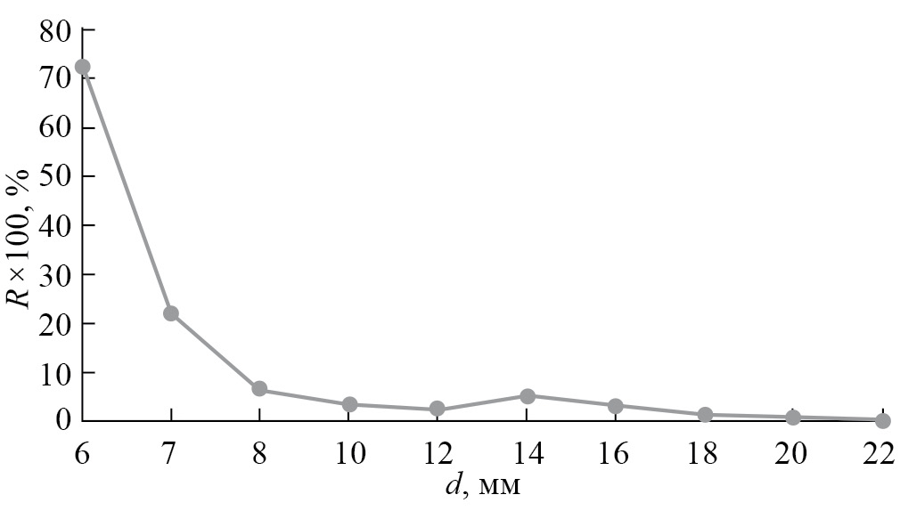 где n – общее число распространяющихся мод волновода на данной частоте, i – номер моды в порядке убывания продольного волнового числа. Для 24 ГГц число распространяющихся (имеющих действительное продольное волновое число) мод составляет n = 32. Полученный график коэффициента отражения в зависимости от диаметра выходного отверстия представлен на рис. 4.