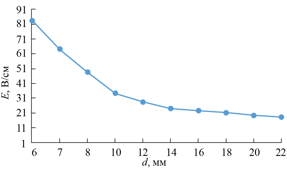 На рис. 5 представлена зависимость максимальной напряженности электрического поля от диаметра выходного отверстия плазмотрона при мощности падающего излучения, которая во всех расчетах составляла 1 Вт.