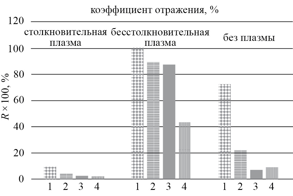 Рис. 7. Сравнение коэффициента отражения R (%) в модели плазмотрона без плазмы, с плазменным цилиндром, при ne = 6 × 1012 см−3 без учета столкновений и со столкновительной плазмой (νc = 1012 c−1) при разных значениях диаметра выходного отверстия плазмотрона: d = 6 (1), 7 (2), 8 (3) и 10 мм (4).