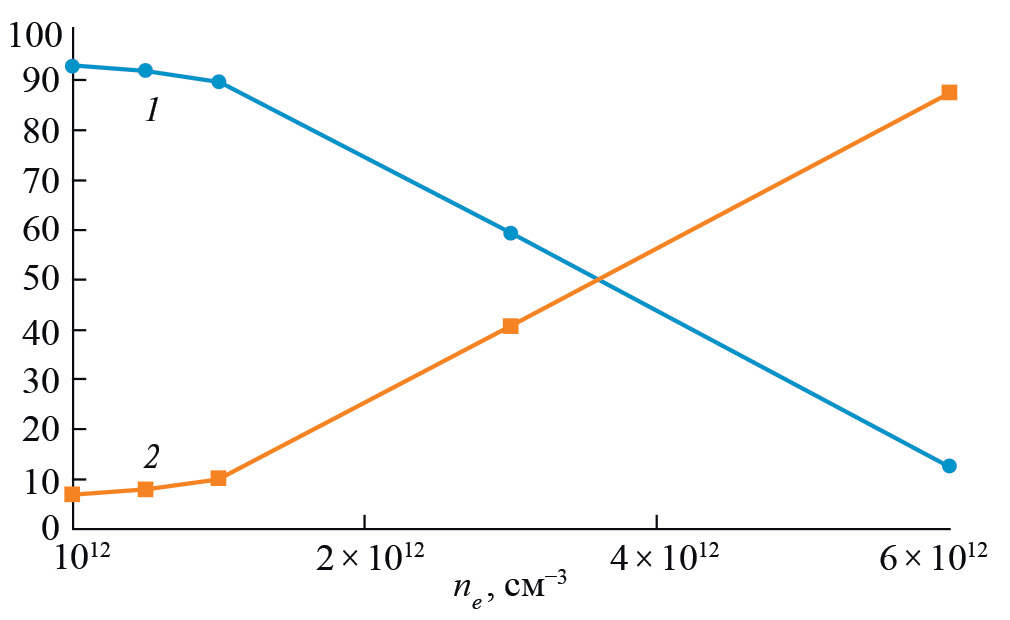 где E – энергия электронов, эВ, Pc – вероятность столкновений, см−1 × Торр−1, p – давление, Торр. Для разряда атмосферного давления (p = 760 Торр) в потоке углекислого газа вероятность столкновений находится в диапазоне 30 … 50 см−1 × Торр−1 для характерных значений энергии электронов [7], что дает значения νc = (1.05 … 1.25) × 1012 c−1. Для удобства в расчетах частота столкновений νc принималась равной 1012 c−1. Стоит отметить, что по результатам измерений плотность и температура плазмы слабо зависят от мощности нагрева. В намного большей степени на режим горения влияет компонентный состав плазмообразующей смеси. Поэтому можно считать задачу линейной для тех режимов, в которых разряд поддерживается стабильно.