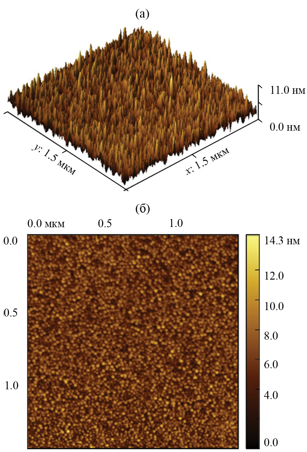 Рис. 2. Фрагмент поверхности гетероструктуры NiO/LiNbO3 (а) и его морфология (б); изображение получено с помощью атомно-силового микроскопа.