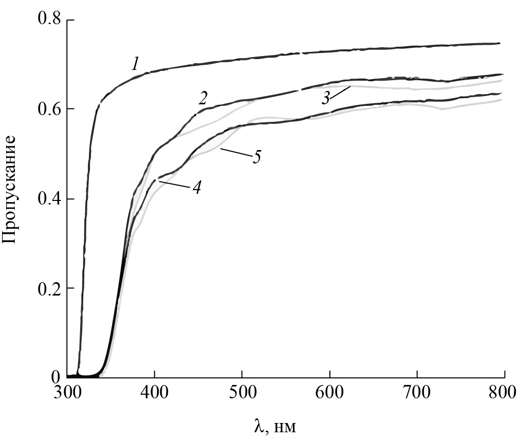 Рис. 4. Спектры пропускания исследуемых образцов: 1 – только подложка LiNbO3, 2–5 – гетероструктуры пленка NiO/подложка LiNbO3 со слоем NiO разной толщины: d = 300 нм (2) образец 2, d = 320 нм (3) образец 3, d = 380 нм (4) образец 4, d = 525 нм (5) образец 5.