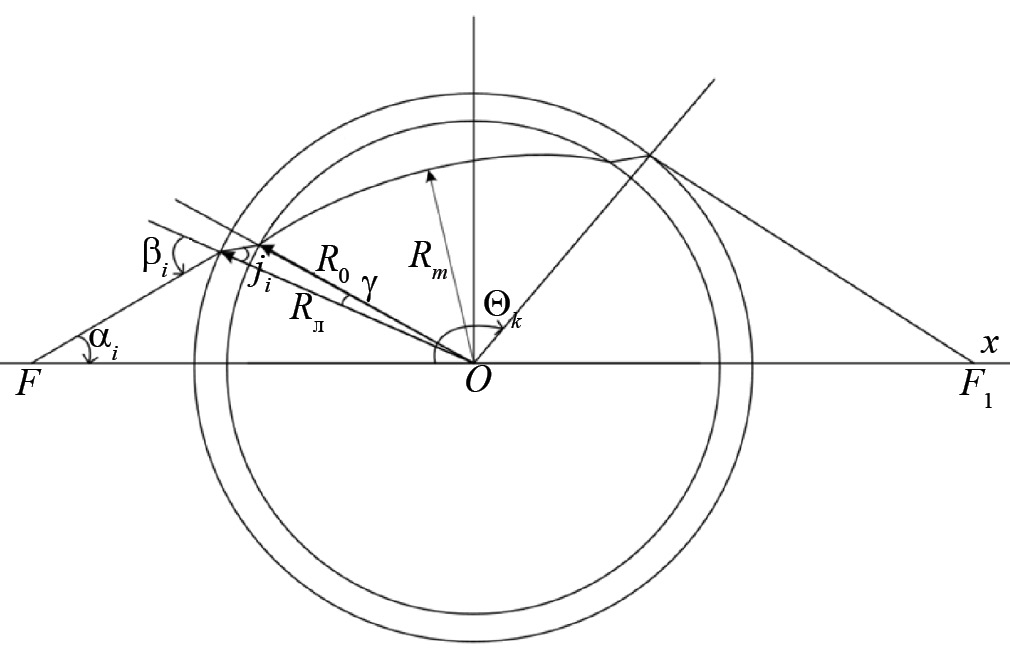 где i = 1,2, …, k, α0 = arcsin(1/F). Подставляя h1, n0, R0 в уравнение (11), находим B1. Подставляя B1 в (14), находим Rm1 и n(Rm1) = h1/Rm1. Далее находим параметры следующего слоя (R2, n(R2)) и т. д.