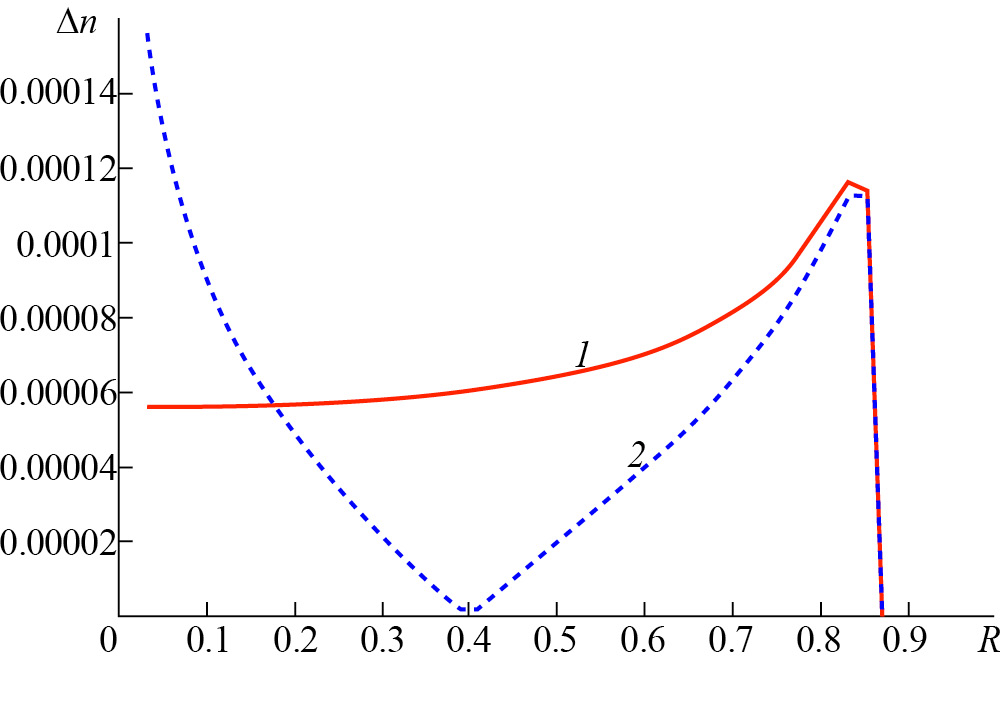 На рис. 4 приведены графики модуля разности коэффициентов преломления в зависимости от радиуса для параметров , F≈ 1.06, k = 50, найденных по изложенной методике и по точному решению для изотропной линзы (1), (3). Из рисунка видно, что максимальная погрешность определения зависимости n(R) из уравнения луча меньше, чем при использовании уравнения эйконала.