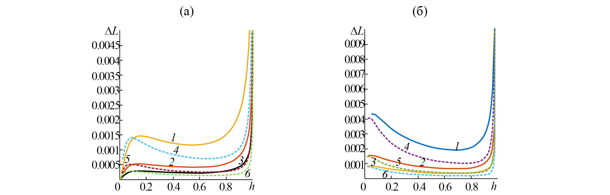 Рис. 6. Зависимости погрешности синтеза линзы (∆L) от лучевого параметра: а – из уравнения эйконала, б – из уравнения луча; линза без оболочки (1–3), линза с оболочкой (4–6); число слоев: 50 (1, 4), 100 (2, 5), 150 (3, 6).