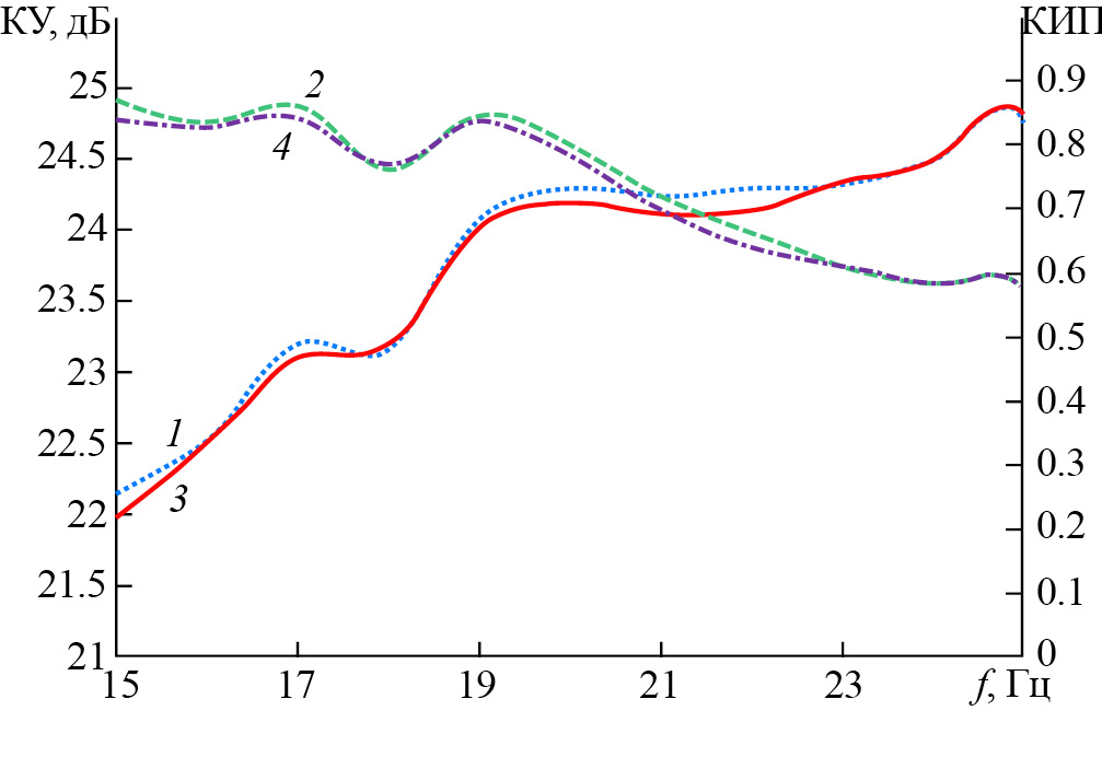 Рис. 9. Зависимости от частоты коэффициента усиления и величины КИП антенны на основе анизотропной линзы Люнебурга с оболочкой (1, 2) и без оболочки (3, 4): КУ (1, 3), КИП (2, 4).