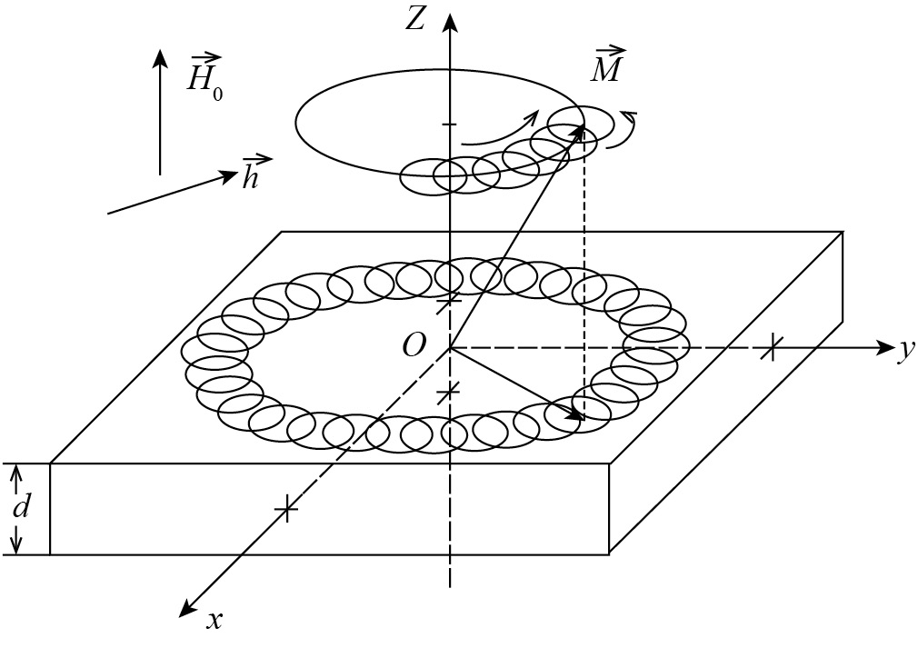Магнитная пластина толщиной d намагничена по нормали постоянным полем . В плоскости пластины приложено переменное поле , имеющее круговую поляризацию. Плоскость Oxy декартовой системы координат Oxyz совпадает с плоскостью пластины. Внешнее поле предполагается меньшим поля размагничивания , так что вектор намагниченности в равновесном положении отклонен от нормали к плоскости пластины, т. е. находится в условиях ориентационного перехода. Поляризованное по кругу поле заставляет вектор намагниченности прецессировать вокруг положения равновесия, которое само в свою очередь приходит в прецессионное движение по большому кругу. Получающийся в результате прецессионный портрет, представляющий собой большое кольцо, заполненное по образующей малыми кольцами, показан на рис. 1 в плоскости пластины.