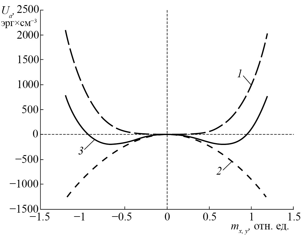 Как видим, оба слагаемых представляют собой параболы, ветви которых при увеличении mx неограниченно возрастают (во всяком случае до mx → 1). Если обе константы положительны, то потенциал Ua имеет единственный минимум, соответствующий mx = 0, т. е. намагниченность в равновесии будет выстроена точно вдоль оси Oz. Однако если константа K4 положительна, а K2 отрицательна, то слагаемые потенциала действуют в противоположных направлениях, так что возможно существование двух минимумов, разделенных максимумом. Такая ситуация представлена на рис. 2, где кривая 1 соответствует второму слагаемому потенциала (7) с положительной константой K4, а кривая 2 – первому слагаемому (7) с отрицательной константой K2. Кривая 3 соответствует сумме первых двух, так что на ней четко наблюдаются два минимума, разделенные максимумом.