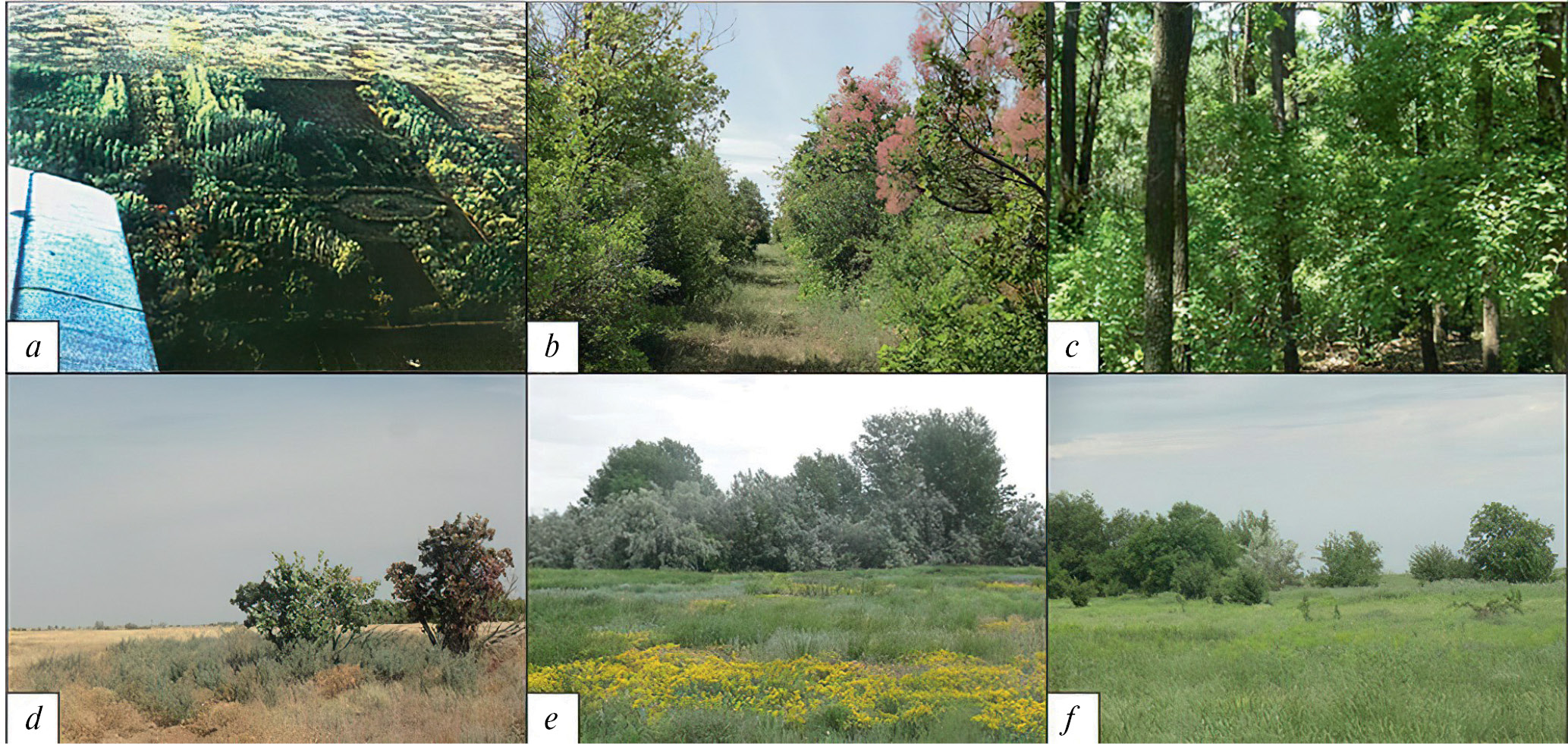 Fig. 1. Arboretum on meadow-chestnut soils of a large mesodepression: aerial view (a), main aisle of the arboretum (b), massive oak plantings (c), arboretum on the soils of solonetzic complex (d), overgrown unused pond (e), overgrown fallow field (f).