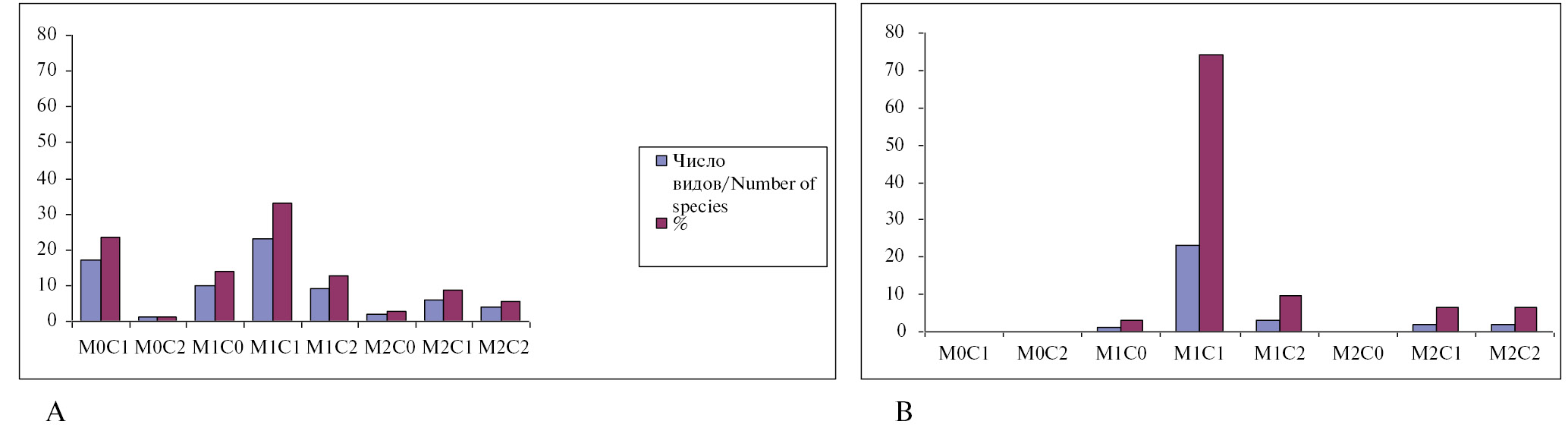 Рис. 2. Соотношение количества сохранившихся видов материнских (М) и самосевных (С) экземпляров в дендрариях Джаныбекского стационара на лугово-каштановых почвах (А) и на солонцовом комплексе (В).