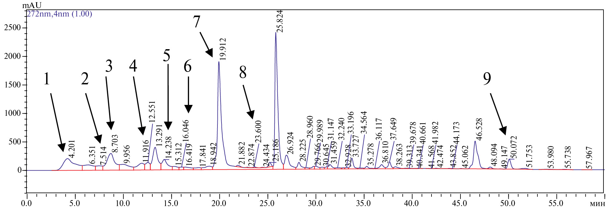 Рис. 1. Хроматограмма этанольного экстракта надземной части Centaurea ruthenica (ЦП 4) при длине волны 272 нм.
