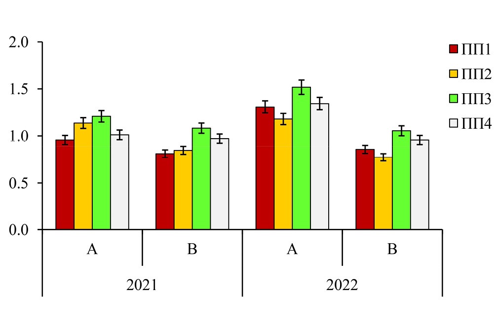 Рис. 2. Содержание азота в хвое 1-го (А) и 2-го года жизни (В) у Pinus sylvestris на посттехногенных землях (ПП 1, ПП 2, ПП 3) и в естественных условиях сосняка брусничного (ПП 4) в июле 2021 и 2022 гг. По горизонтали – год исследования; по вертикали – содержание элемента, % сухой массы.