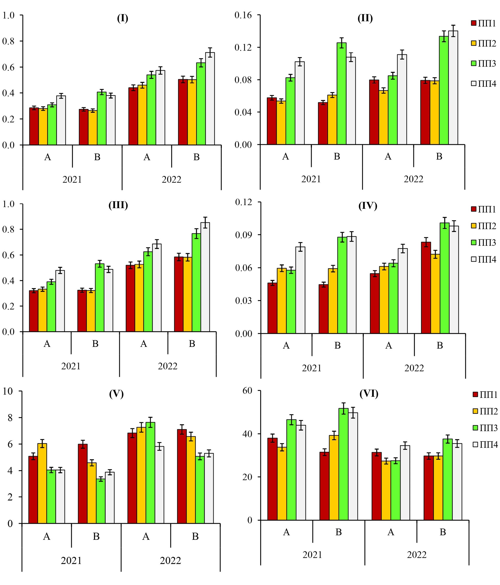 Fig. 3. The content of Chl а (I), Chl b (II), Chl (а+ b) (III), Car (IV), Chl a/Chl b ratio(V) and LHC (VI) in current-year (A) and 1-year-old (B) needles of Pinus sylvestris on post-technogenic lands (SP 1, SP 2, SP 3) and in natural lingonberry pine forest (SP 4) in July 2021 and 2022. X-axis – year of the study; y-axis – pigment content, mg/g wet weight, LHC, %.