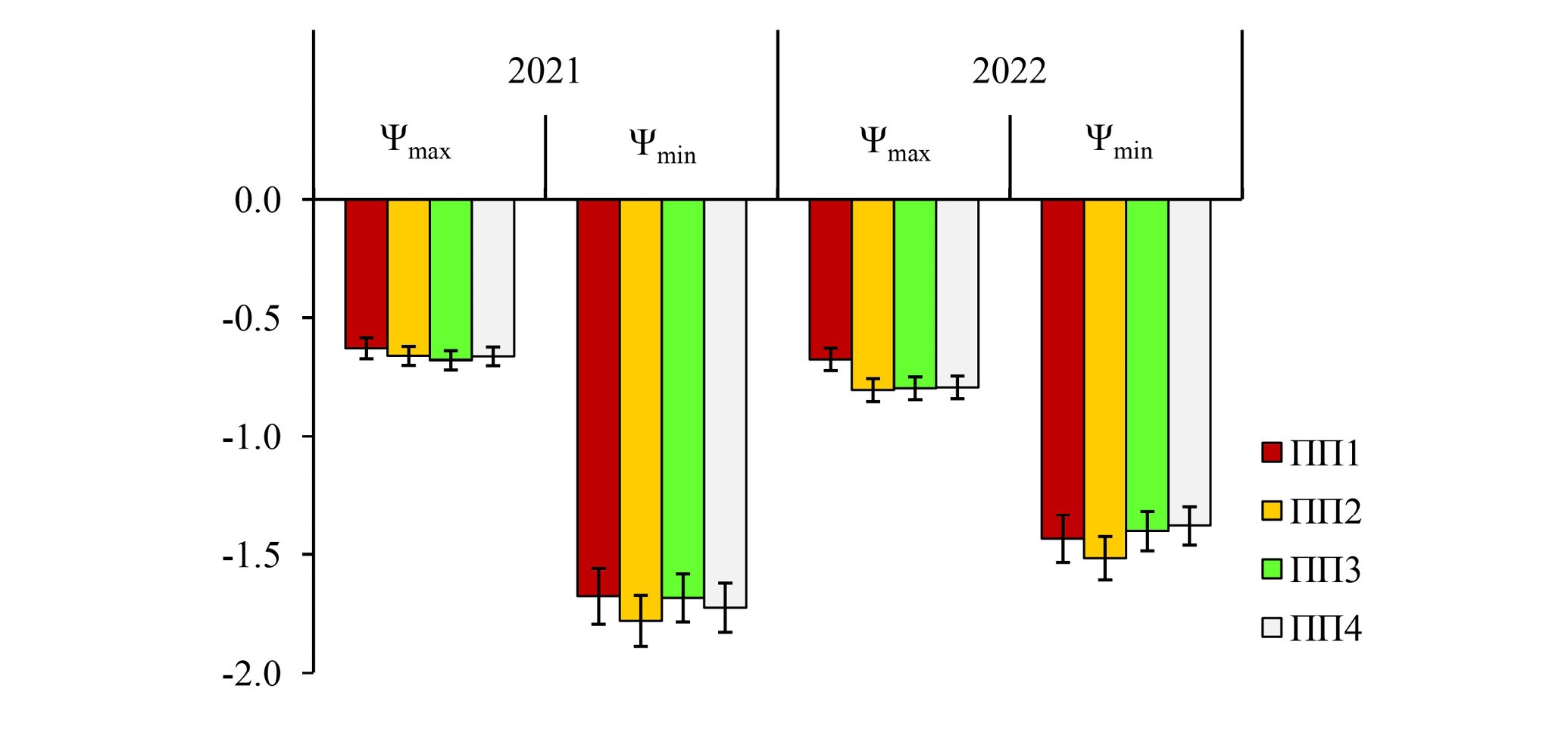 Сопоставление предрассветных (Ymax) и полуденных (Ymin) величин водных потенциалов охвоенных побегов P. sylvestris за двухлетний период выявило их сходство на разных экспериментальных участках (рис. 4) и существенные межгодовые различия. Так, в засушливый вегетационный период 2021 г. отмечены в 1.2 раза более высокие (менее отрицательные) значения Ymax на фоне более низких (в 1.2 раза) значений Ymin охвоенных побегов P. sylvestris на всех ПП относительно более дождливого вегетационного периода 2022 г.