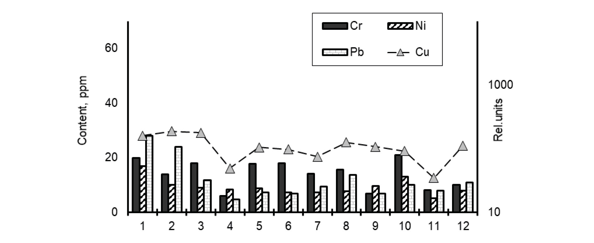 Данные о среднем содержании некоторых ТМ в Potamogeton pectinatus (рдест гребенчатый) в спектре микроэкологических условий в пелагиали западного побережья оз. Байкал показаны на рис. 1. Выявлены различия в содержании Cr, Ni, Pb, Cu в надземных частях рдеста в прибрежных акваториях. Содержание Cr в большинстве пунктов обследования превышает ПДК (10 мкг/г), а содержание Ni и Cu, в основном, меньше ПДК. Достаточно высокое содержание Pb обнаружено в наиболее посещаемых бухтах Базарная (9.7 мкг/г) и Куркутская (7.6 мкг/г), в которых превышение содержания этого элемента по сравнению с содержанием в других пунктах (5.6–5.0 мкг/г) составило в 1.5 раза. Установлено, что увеличение туристического потока в летнее время при отсутствии необходимой инфраструктуры на водоохранной территории по сравнению с фоновыми нагрузками, влечет конвертирование химических сбросов антропогенной природы в фитомассу водных растений [20].