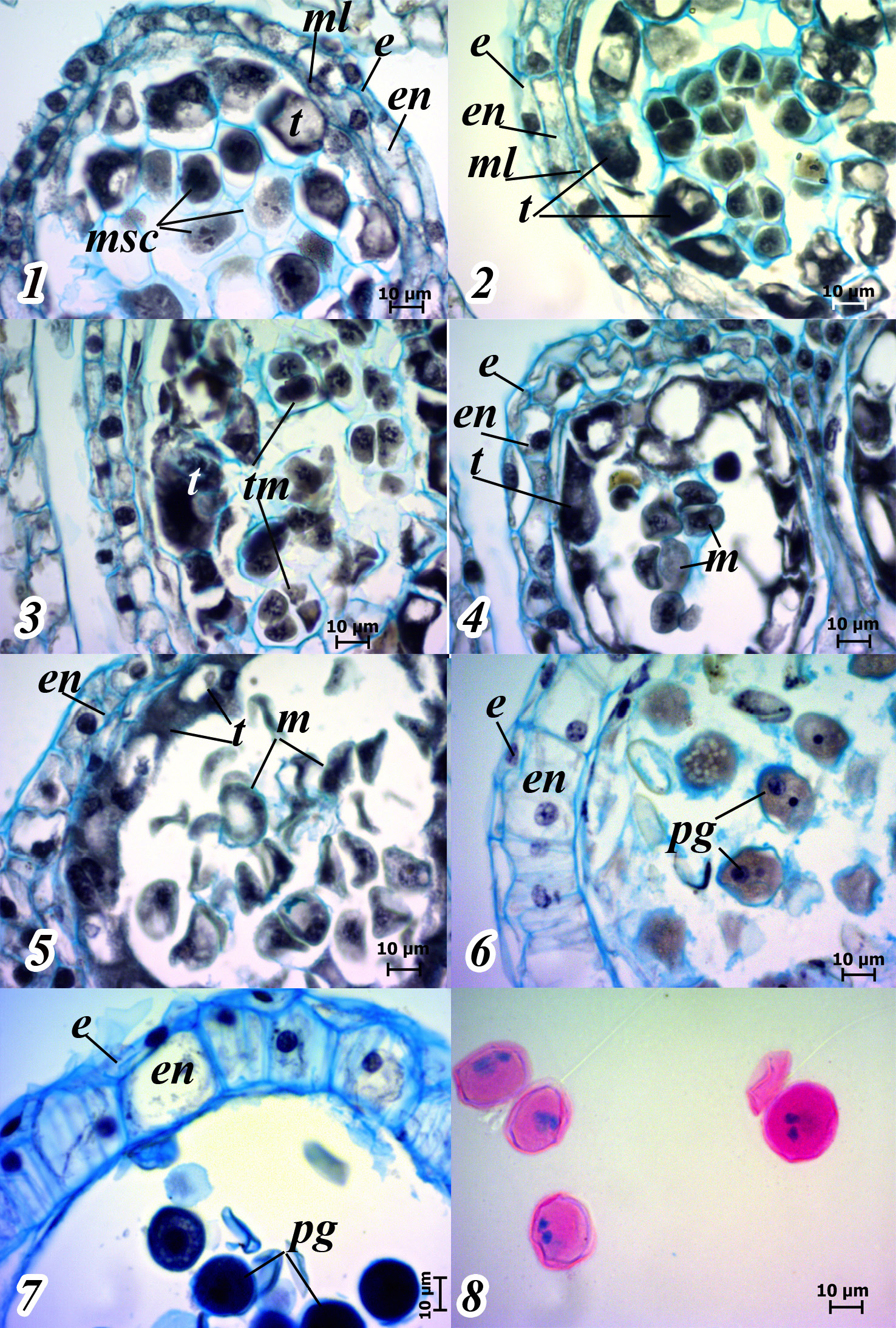 Fig. 3. Cross sections of the microsporangium of Danae racemosa at the stages of meiotic (1, 2) and postmeiotic development (3–7) and mature pollen grains (8): 1–3 – microsporogenesis; 4 – the stage of young microspores; 5 – the vacuolized microspores; 6 – formation of two-cell pollen grains; 7 – the wall of mature microsporangia and three-cell pollen grains (8) (e – еpiderma; en – endotecium; m – microspores; ml – middle layer; msc – microsporocytes; pg – pollen grains; t – tapetum; tm ― tetrad of microspores). Scale bar – 10 μm.
