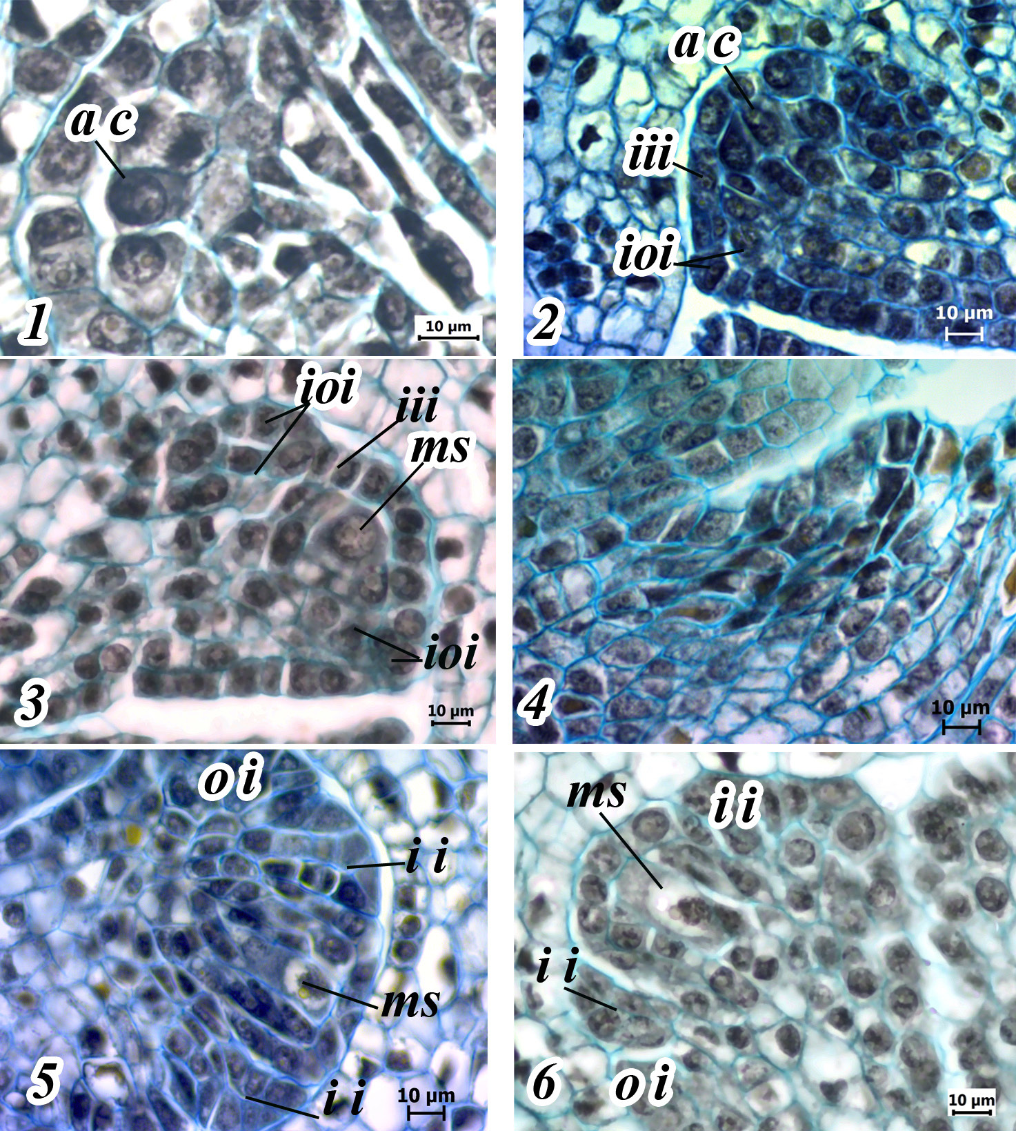 Fig. 4. Ovules of Danae racemosa in the early stages of development: 1–3 – primordial ovule at the stage of the archesporial cell; 4 – degeneration of the ovule; 5, 6 ovules at the stage of megasporocyte and differentiation of integuments (ac – archesporial cell; ii – internal integument; iii – initial of the internal integument; ioi – initial of the outer integument; ms – megasporocyte, n – nucellus; o i – outer integument). Scale bar – 10 μm.