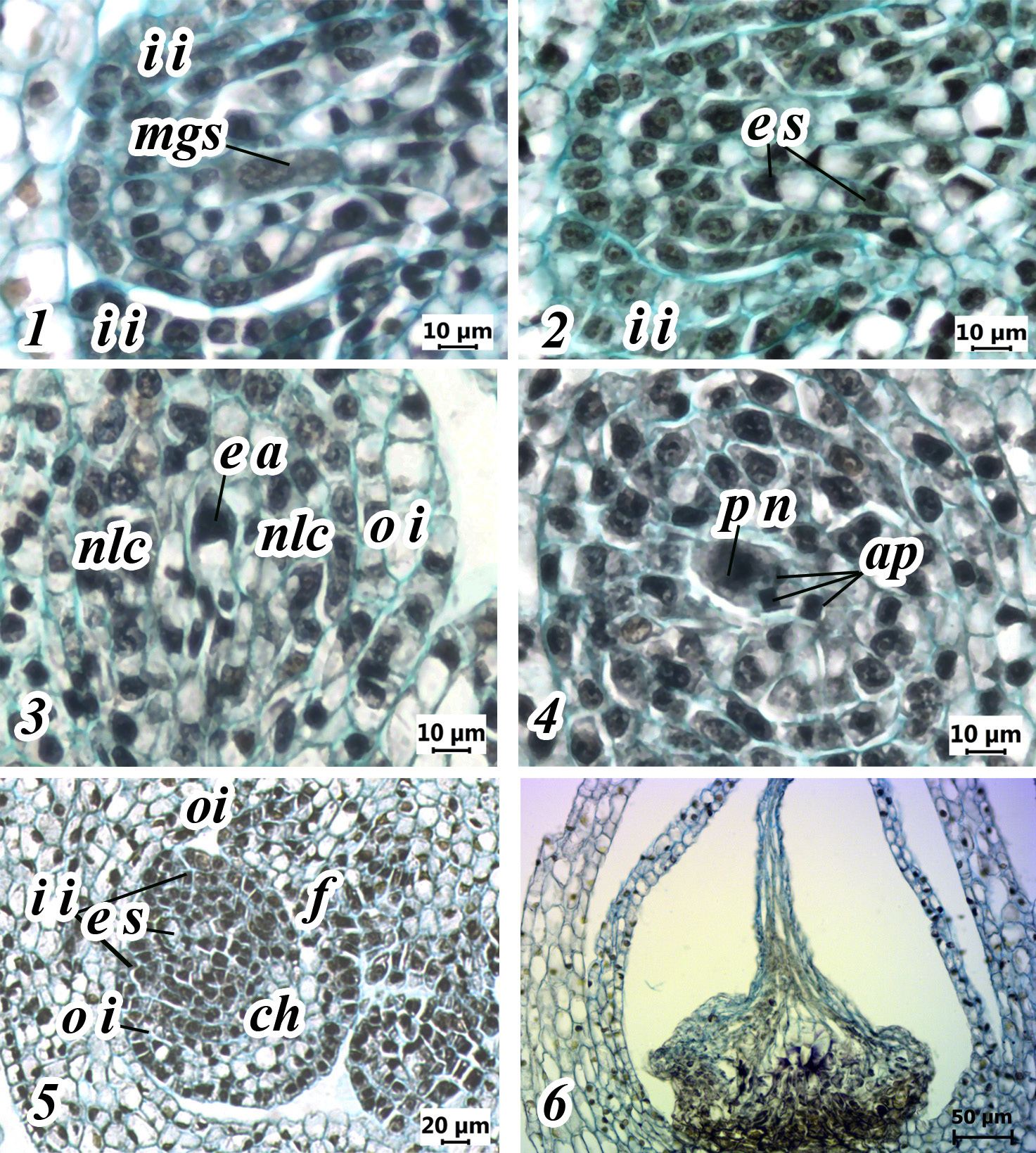 Fig. 5. Ovules of Danae racemosa during megasporogenesis (1, 2), mature embryo sac (3–5) and longitudinal section of the degenerated ovary of the staminate flower (6) (at – antipodes, ch – chalase, cln – cells of the nucellus lateral zone, ea – ovular apparatus, es – embryo sac, f – funiculus, ii – inner integument, oi – outer integument, mgs – megaspore, n – nucellus, pn – polar nucleus). Scale bar: 1–4 – 10 μm; 5 – 20 μm; 6 – 50 μm.