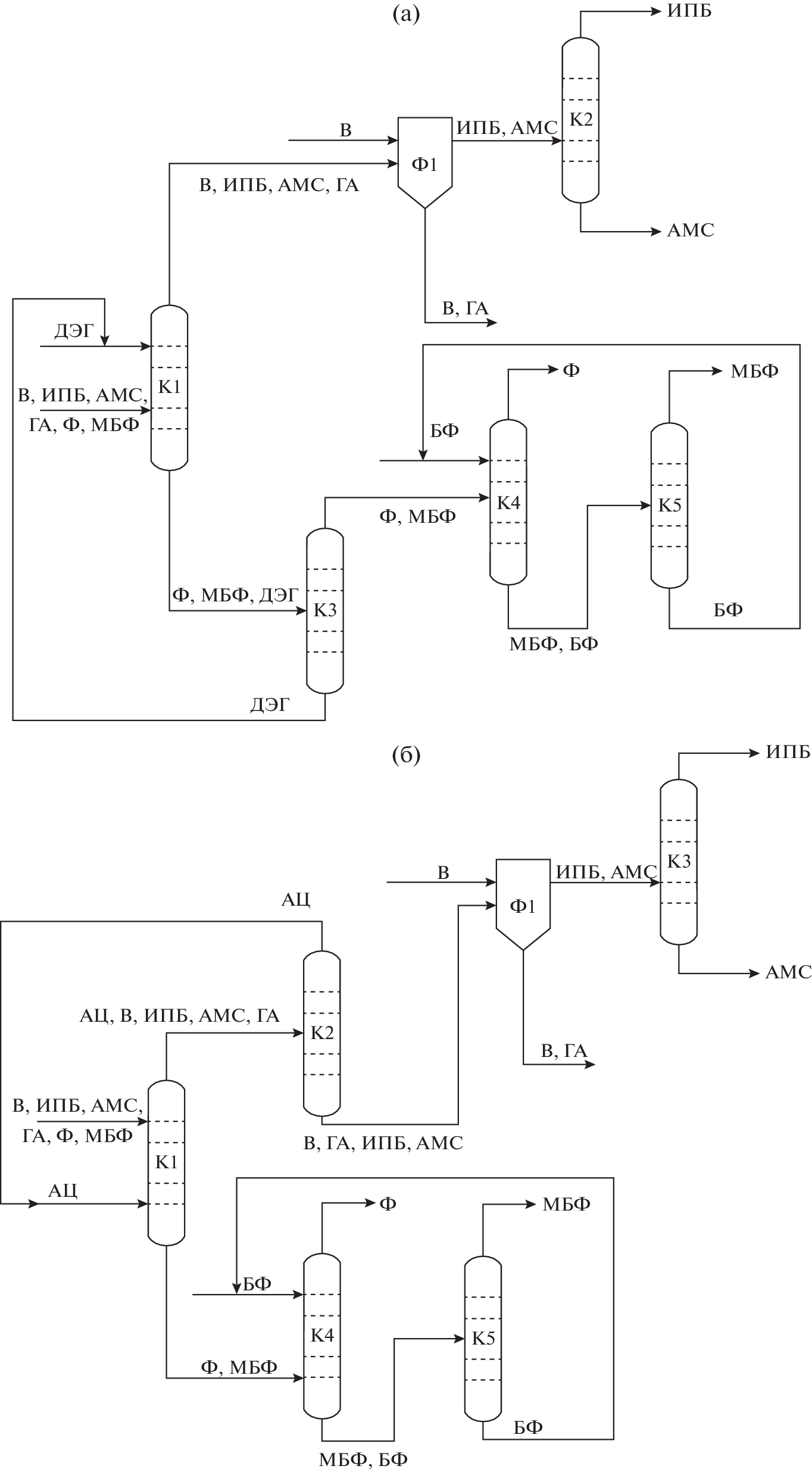 In the large-scale production of phenol by the cumene method, an important constituent is the separation of multicomponent mixtures containing the target products and various impurities. The potential of distillation processes of a specific composition is determined by the structure of the vapor–liquid equilibrium diagram structure. The paper analyzes the phase diagram of a six-component system and its constituents of a smaller dimension. Thermodynamic restrictions on the distillation process associated with the presence of separatric manifolds are established, and ways to overcome them through the use of special techniques are shown. The structures of mixture separation flowsheets are proposed and the columns operation parameters are determined. The use of the re-extractive distillation process is a viable alternative for phenol purification, since it allows the second product of the cumene method, acetone, to be involved in the technological cycle.
