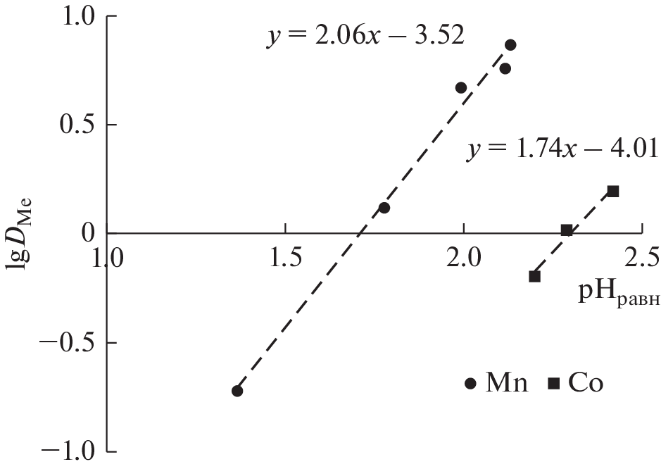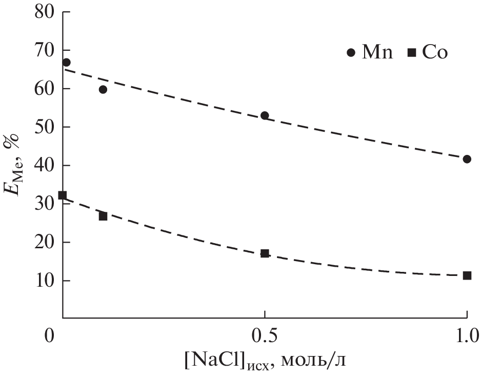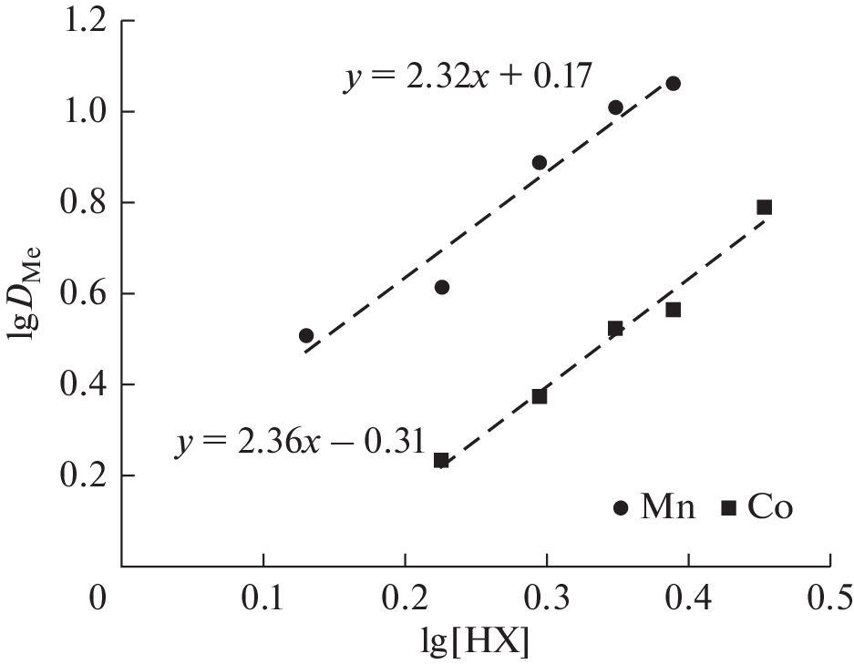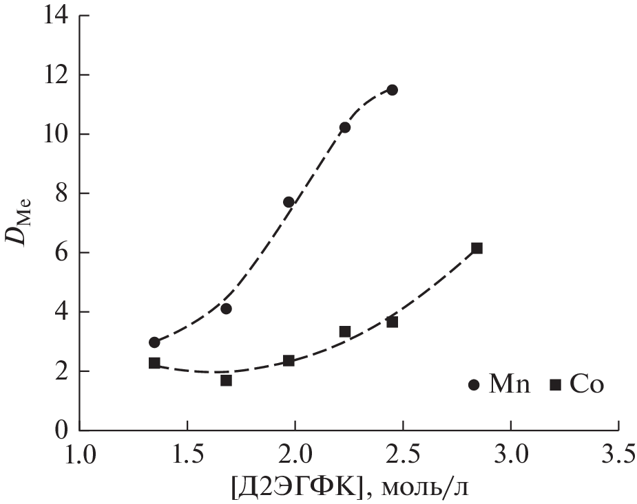 Extraction of Mn(II) and Co(II) from chloride solutions in the system with a hydrophobic deep eutectic solvent (HDES) based on di(2-ethylhexyl)phosphoric acid (D2EHPA) and menthol is studied depending on the aqueous phase acidity, the HDES composition, the concentration of chloride ions, and the volume ratio of the system phases. The extraction mechanism for the studied metals is established. A thermodynamic analysis of the extraction process in the proposed system is carried out. Evaluation of the possibility of reusing the HDES D2EHPA/menthol on the example of the extraction of Mn(II) ions is performed for the first time. The potential for the application of the proposed HDES for isolation of metals from aqueous solutions is demonstrated.
