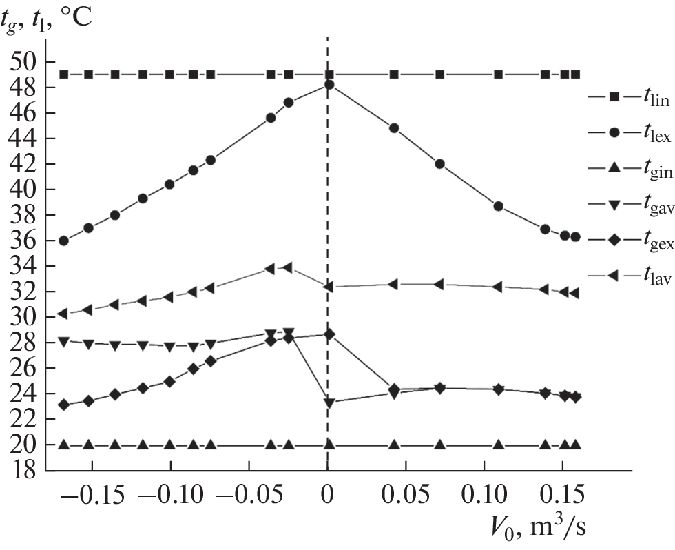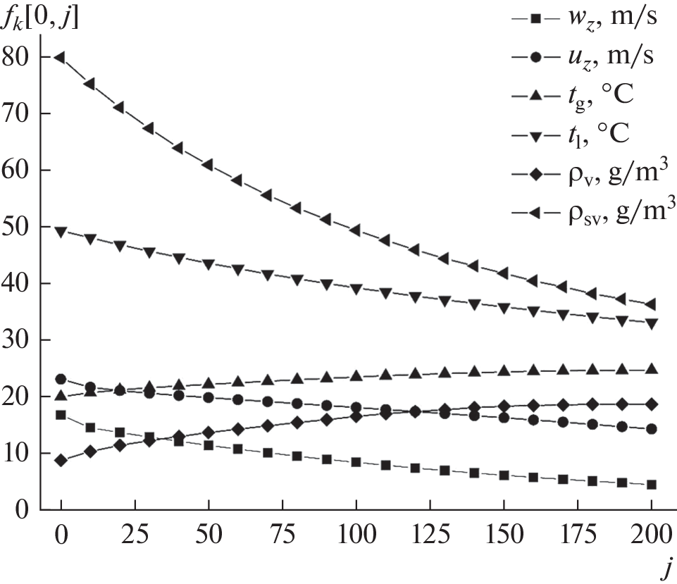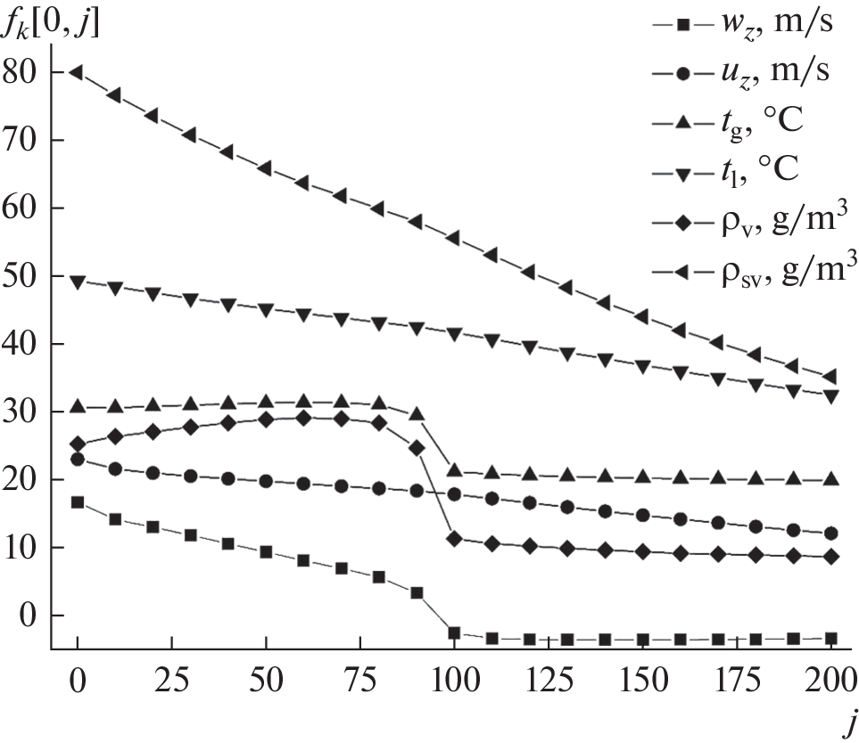 The article presents new details of an algorithm and compares the results of calculating the heat and mass transfer of water and air in spray apparatus for the regimes of cocurrent and countercurrent of phases, taking into account the early crisis of drops drag and the accompanying crisis of heat and mass transfer. The mathematical model used is based on nonstationary differential equations for the flow of a compressible medium, supplemented with the equations of heat and mass transfer from drops to the gas. The known explicit Lax–Wendroff scheme is used in difference analogs of the equations of continuity and phases flow. The distributions of phases velocities and temperatures, and densities of water vapor in air and saturated vapor near the surface of drops in the two-phase flow are calculated to compare the co- and countercurrent flows of phases through the cylindrical apparatus. In particular, the calculations determined the dependences of the average temperatures of the gas and the liquid over the outlet section of the apparatus for each phase on the gas flow through it